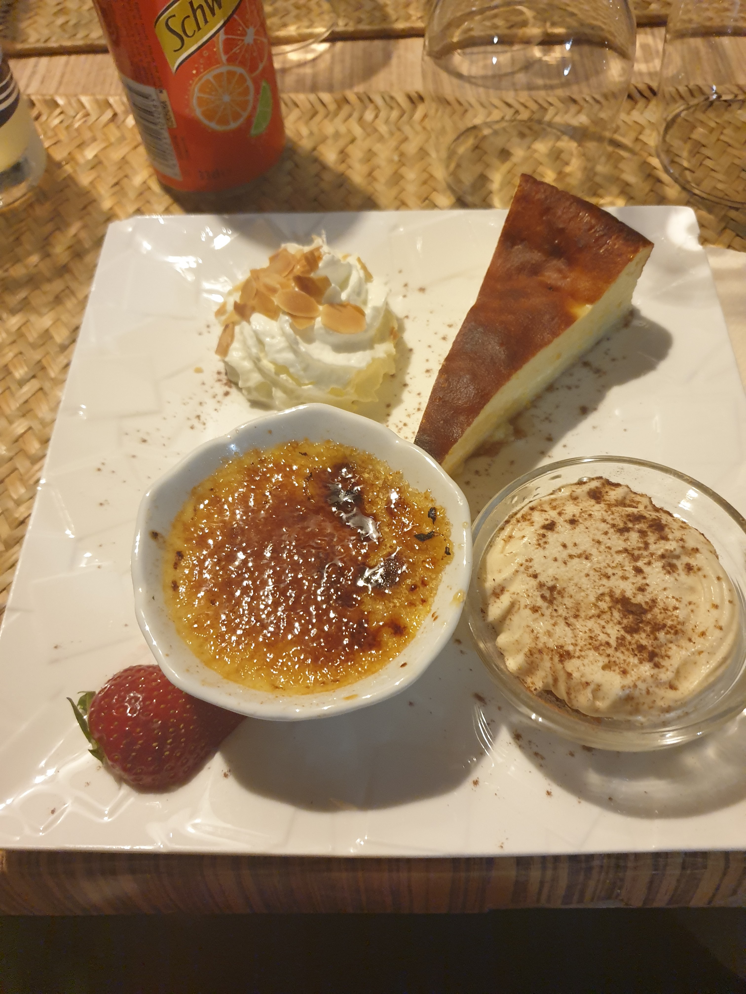 On avait très faim après rando et plage. On a pris 3 plats et 3 desserts pour 2. Ce qui peut surprendre mais on n'avait pas mangé le midi... Tout est délicieux. Ça sent le vrai fait-maison avec des produits de qualité et le service est chaleureux et sincère. Merci merci pour cette belle fin de journée avec en plus une vue magnifique ! Et mon amouuur est d'accord avec mon commentaire.