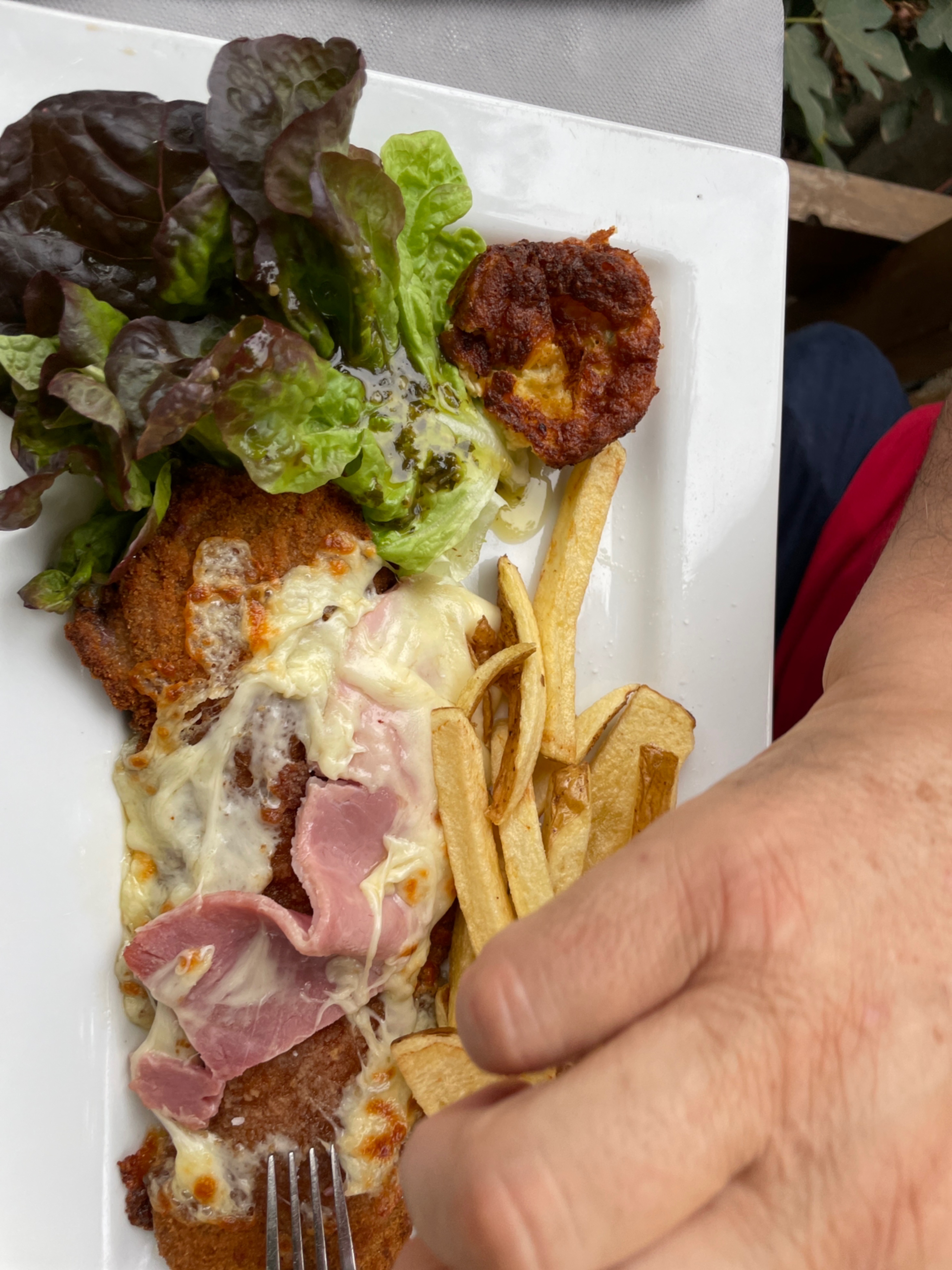 Cadre très sympathique, superbe vue, plats frais et de bonne qualité. Petite visite d'un sanglier domestique pour le bonheur des enfants 🙂 La serveuse par contre, est très antipathique, incapable de nous conseiller en vin parce qu'elle n'aime pas l'alcool 🤔. Elle nous a à peine parlé et expédié nos plats. Dommage, cela gâche le repas...