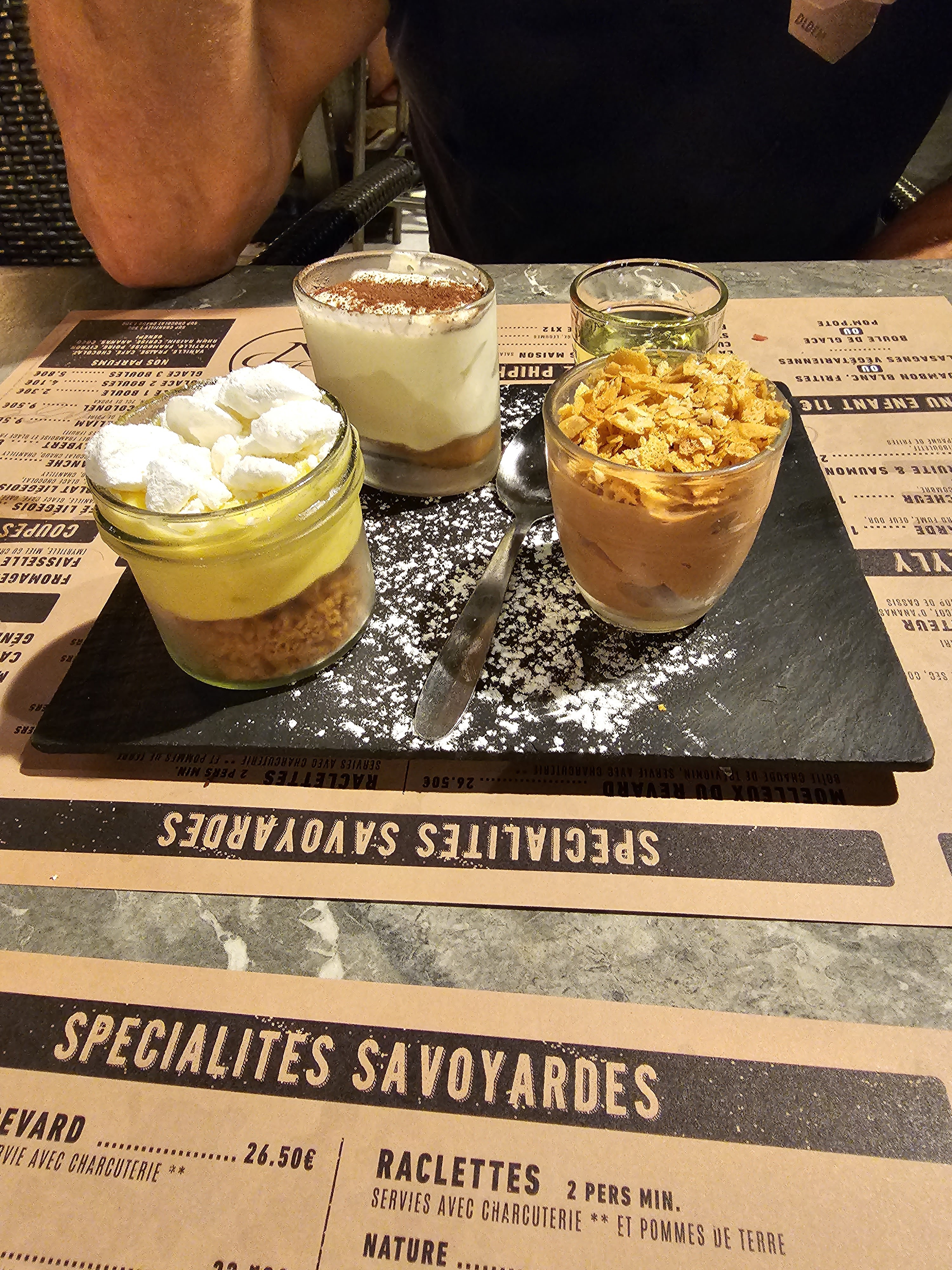 Nous y sommes venus pour boire un verre en terrasse puis revenus 1h après pour y manger. À chaque fois très bien reçus, dans un restaurant très bien décoré et avec des fauteuils/banquettes confortable. Très bonne fondue pour 2, desserts un peu cher, mais très bonne glace avec des morceaux de cookies !