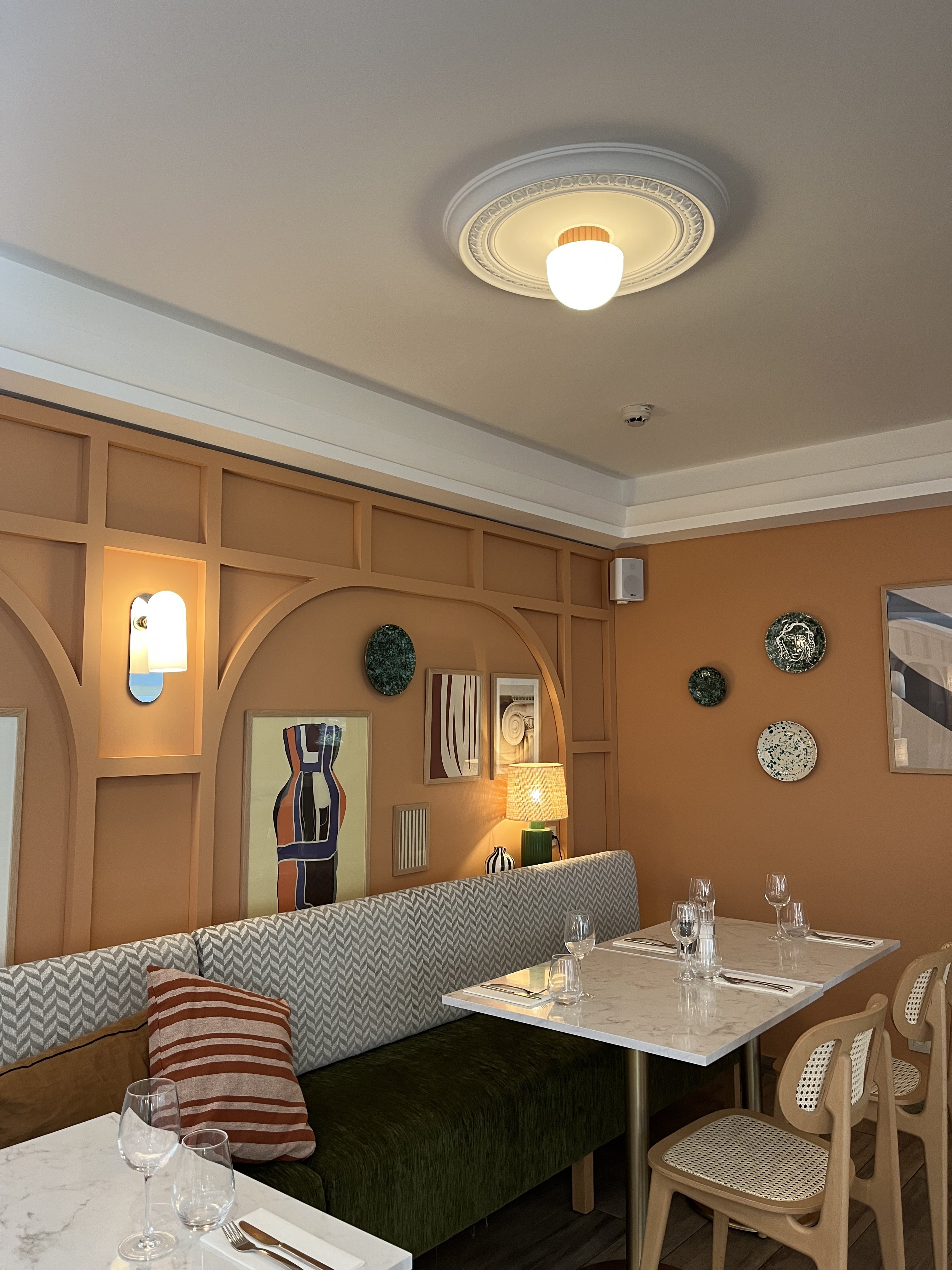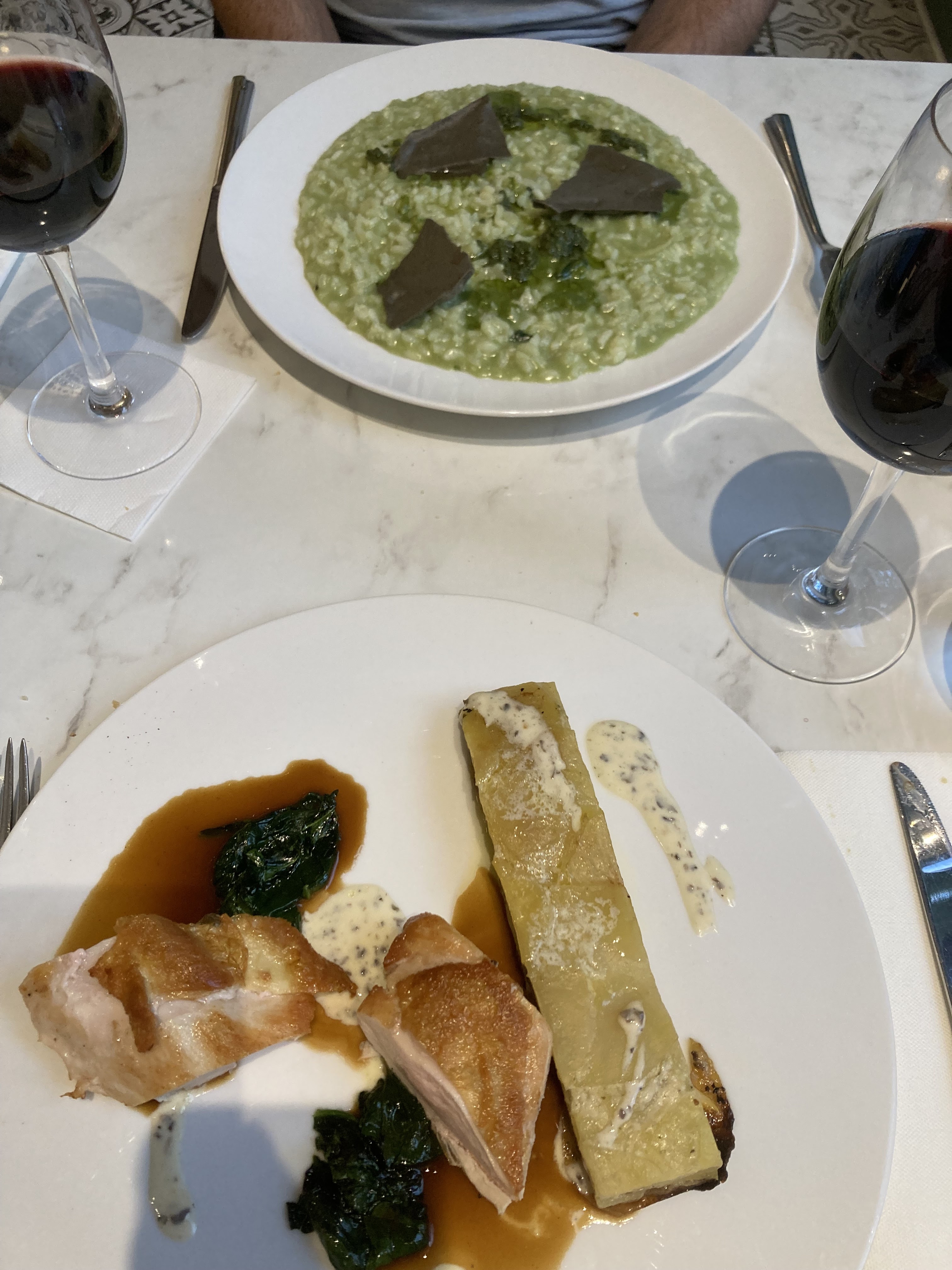 Déjeuner en plein air sur une place calme et élégante : menu du jour à 3 plats à 24 €, service excellent et impeccable, attention aux enfants littéralement oniriques (menu à 12 € avec une escalope de poulet et purée que j'aime encore rêver chez soir, un plat étoilé).