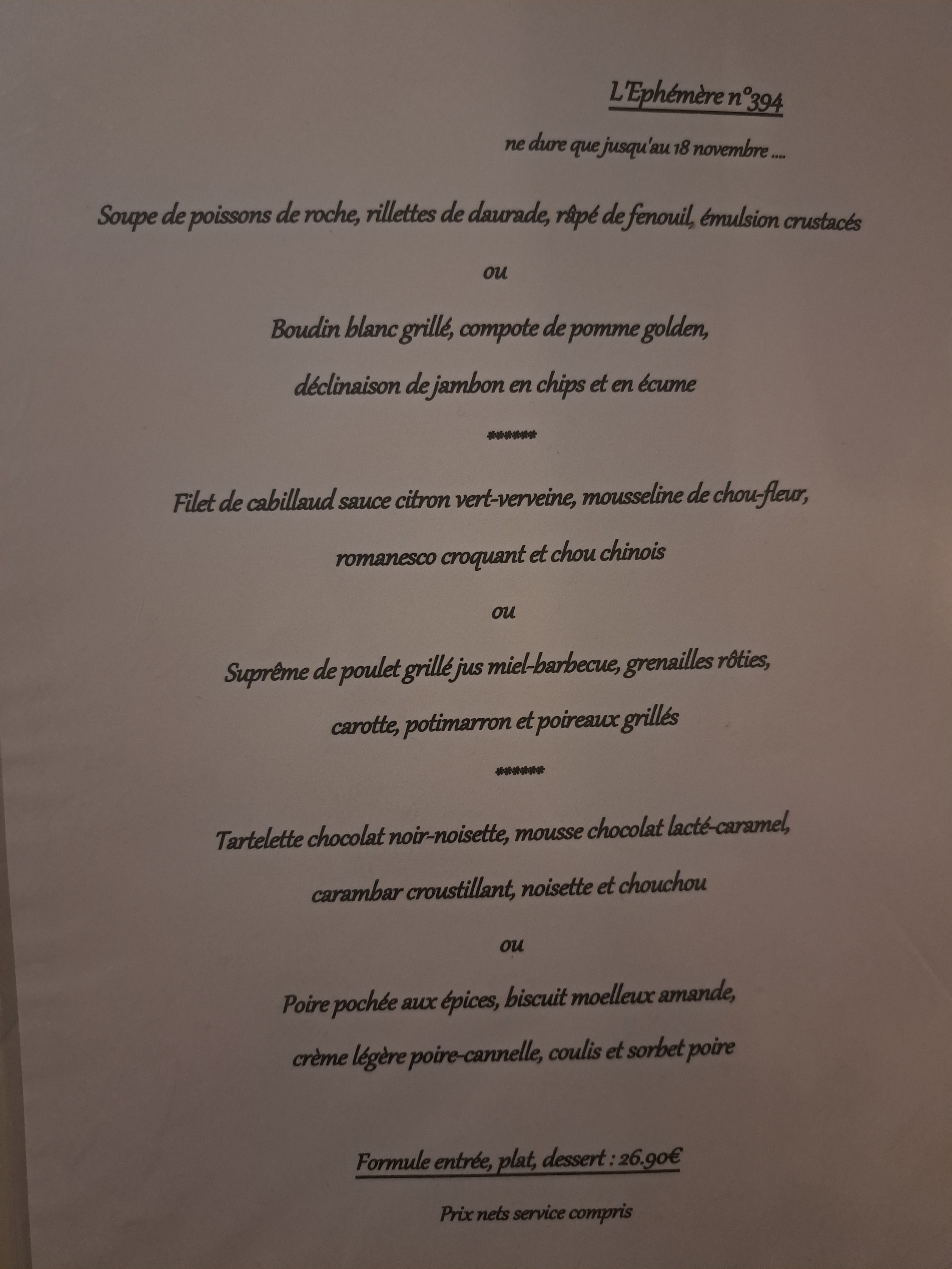 Nous avons testé le menu éphémère à 26 €. En entrée tout le monde a aimé le velouté avec les haricots blancs. Idem pour le plat: le veau était bien cuit et tendre, même si la quantité était assez faible ( le plat avait l'air un peu perdu au milieu de cette grande assiette). En dessert, j'ai beaucoup aimé les déclinaisons chocolat pomme. Ceux qui ont pris la tartelette ont trouvé le biscuit assez dur à manger. Si vous prenez un café ou un thé vous aurez droit à quelques mignardises en bonus :)