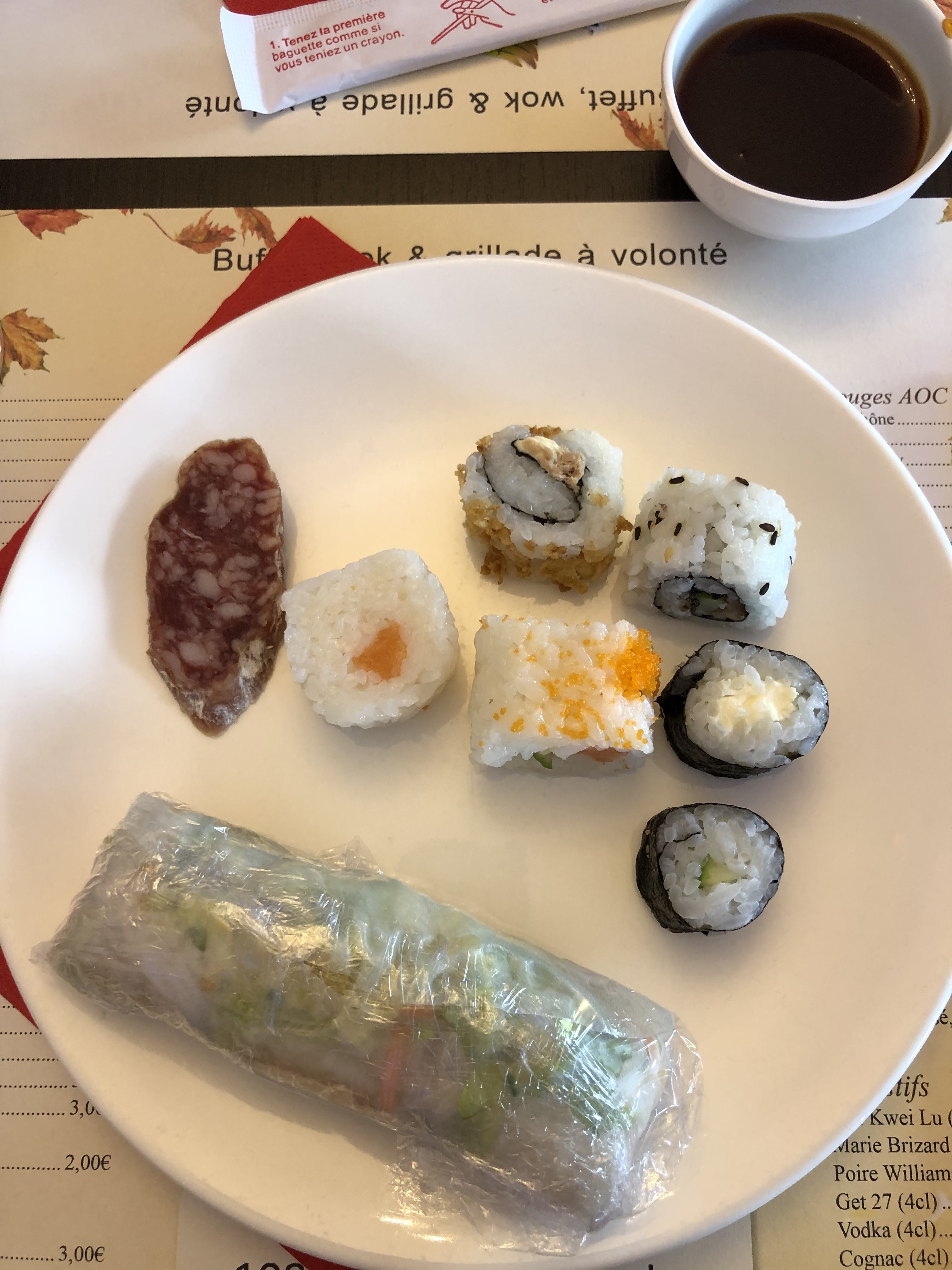 Le restaurant n'a pas d'identité, franco-japonais-chinois... Oui français. À côté des nouilles sauté, des nems et des sushi/maki (japonais), on peut y trouver : œuf mimosa, charcuterie, tomate mozzarella, frites, éclaire à je ne sais quoi, fontaine au chocolat (qui ne tourne pas) ! Mis à part ça, la moitié des plats semblent préparés à l'avance et servis tel quel (rouleaux de printemps sous cellophane) ou pas assez (re)cuit. Je ne vous cache pas que le goût n'y est pas ! Attention : Vérifiez la facture avant de payer, si vous avez eu le courage d'y aller. Marge d'erreur de calcul +5€.