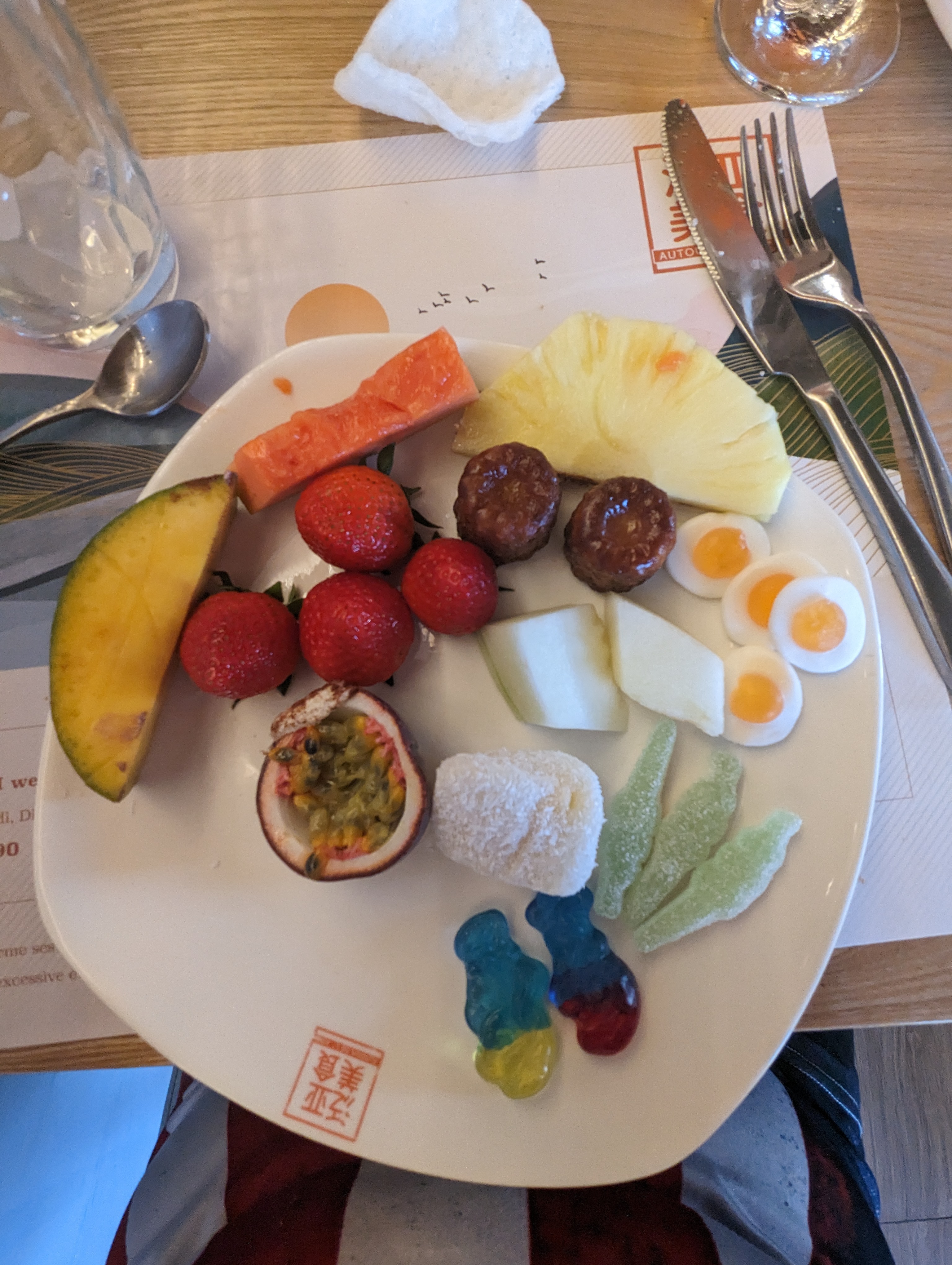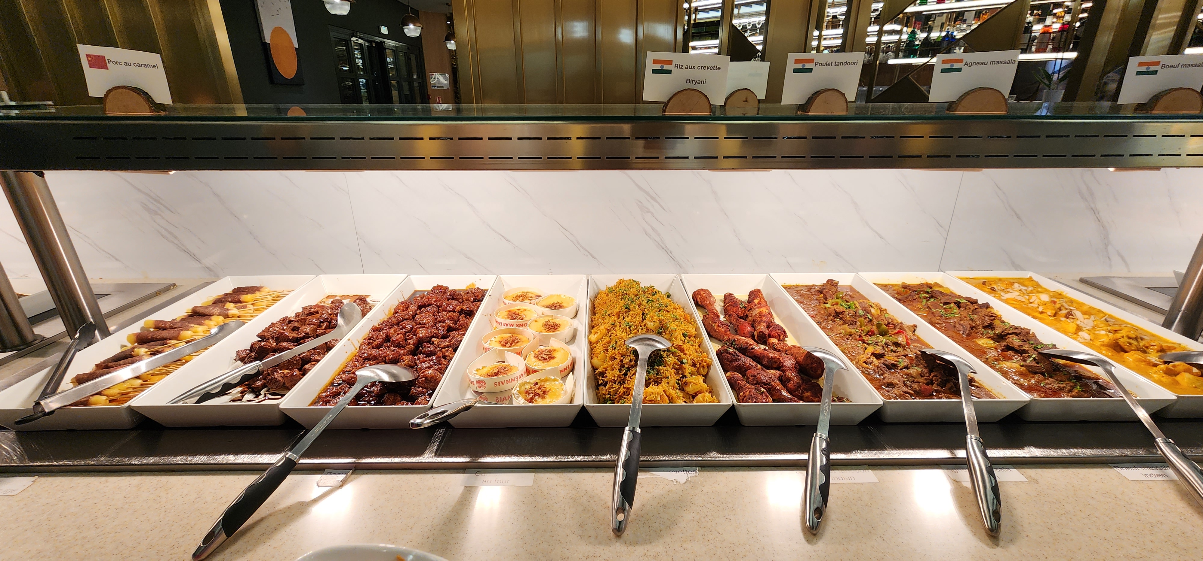 Excellent buffet avec une grande variété de plats (naan, cuisine indienne, cornets et machine à sundae, fruits frais…) Super cadre ! Tarif plutôt élevé mais nourriture de qualité. Seul bémol, le robot serveur qui passe et repasse en musique… mignon toutefois