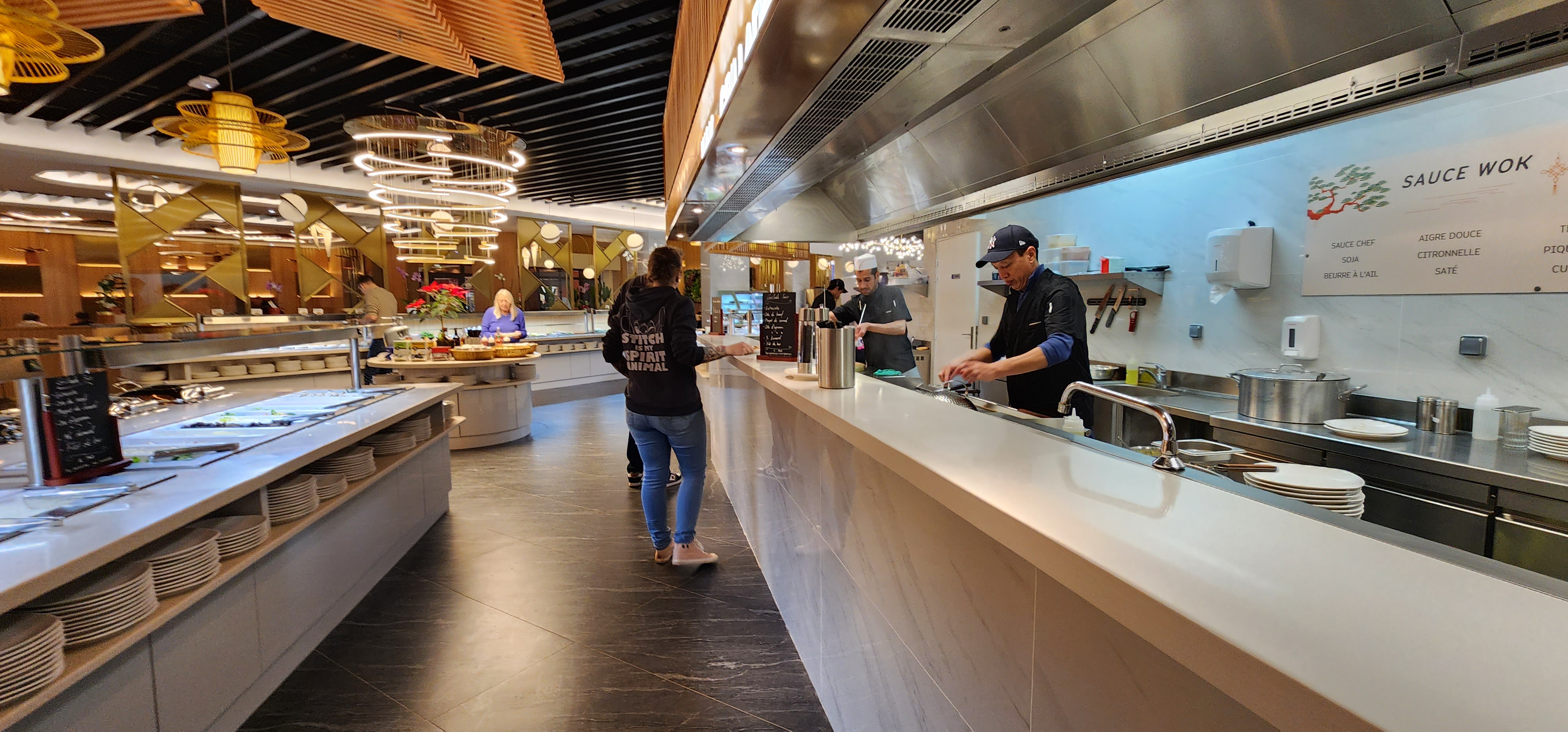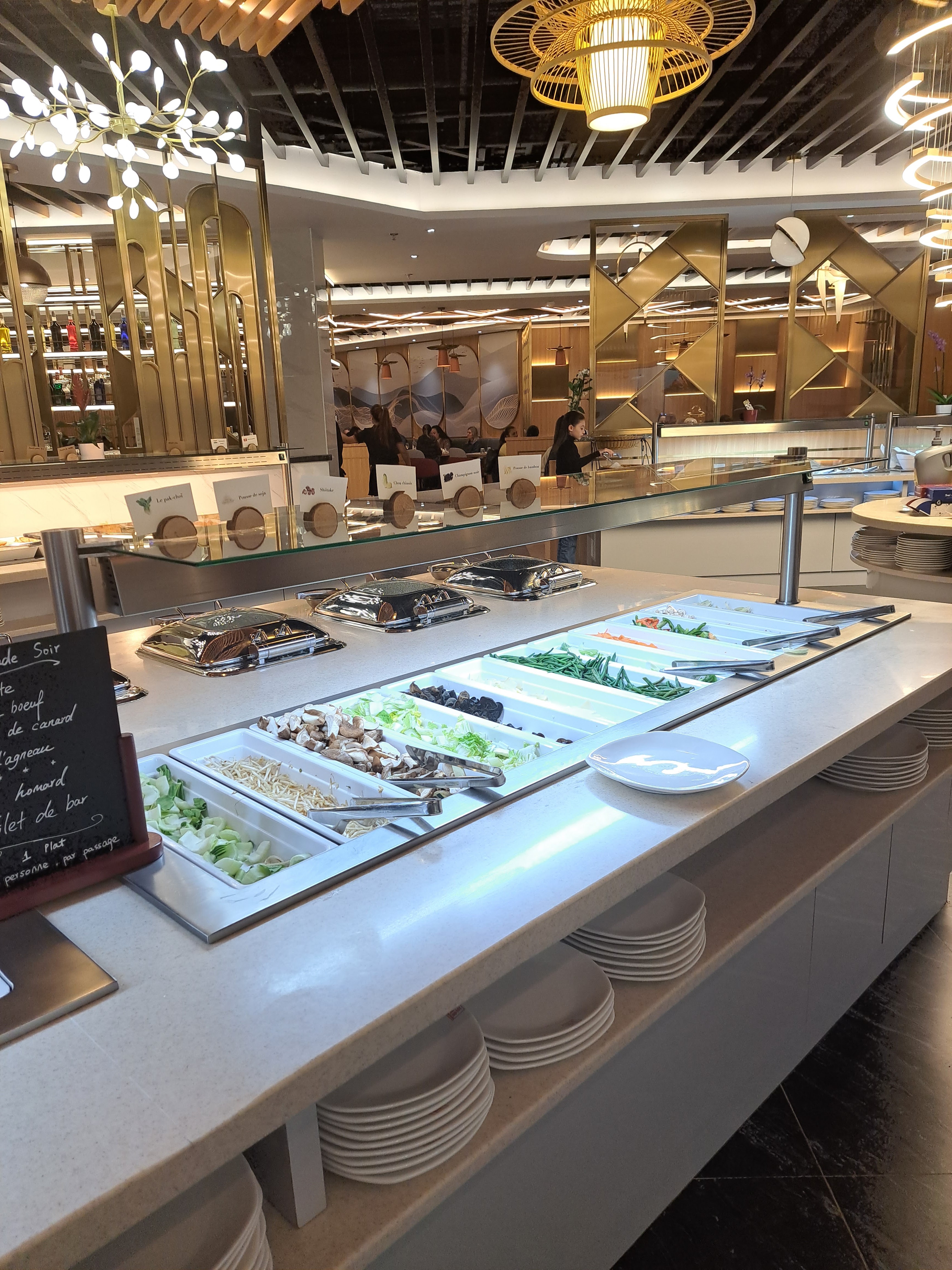 Le restaurant est joli et propre même si la partie vitrée qui donne sur le Géant gâche un peu l’ambiance et le cadre. Le buffet est assez fournit cependant il y a un cruel manque de pinces pour se servir. En effet, pour les personnes présentants des allergènes, il n’y a qu’une pince pour 3 ou 4 plats. De plus, il n’y a aucune carte des allergènes, aucune information sur le nom ou la composition des plats. Mon compagnon a fait une réaction allergique à une raviole au poulet parce qu’à l’intérieur il y avait des traces d’huîtres; mentionnées nulle part. Les pompiers ont dû intervenir. Pour un restaurant qui se veut chic, ce manque de professionnalisme et de vigilance a bien faillit coûter la vie à l’uns de leur clients.