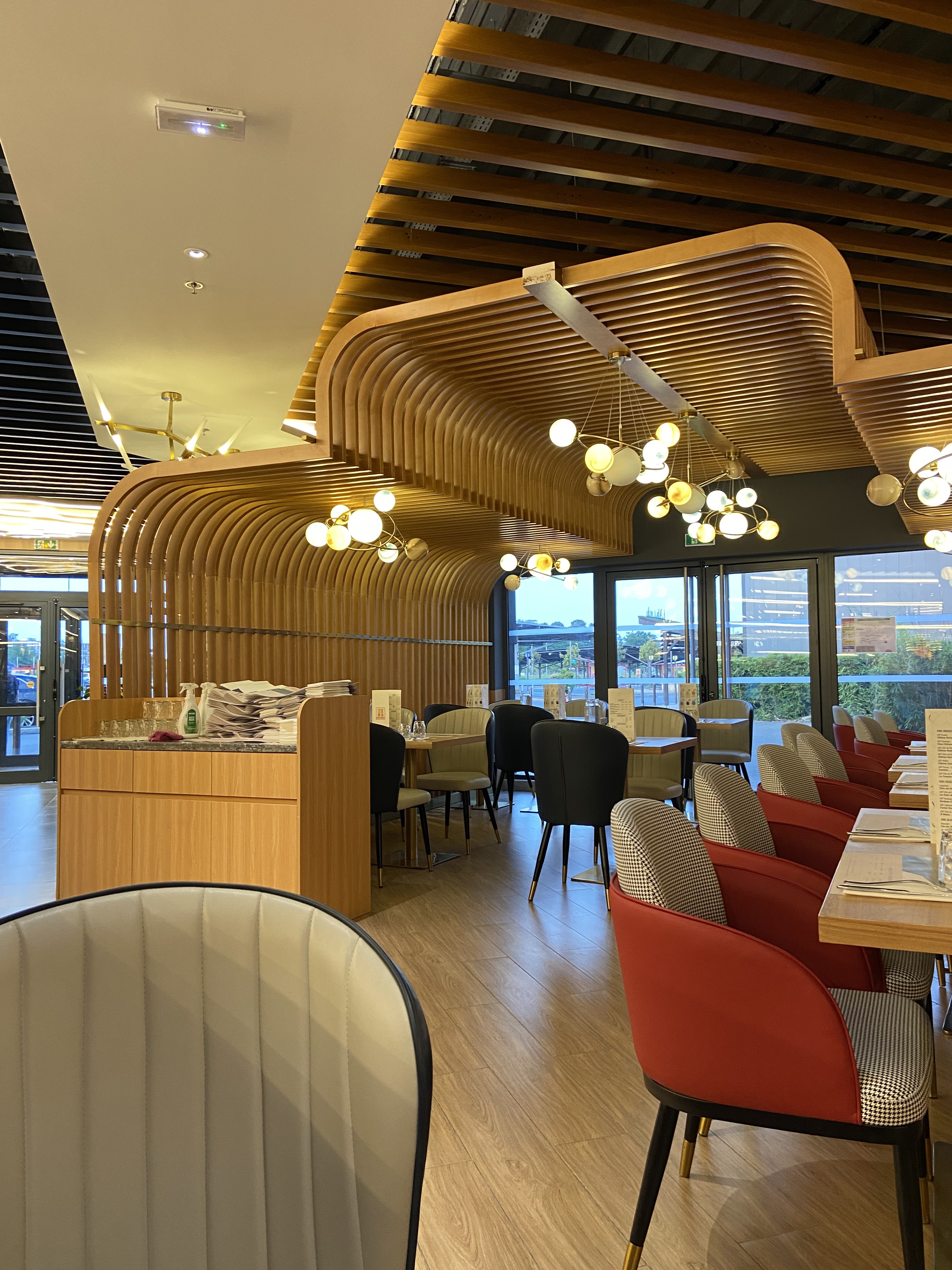 Le lieu est neuf et agréable, les tables ne sont pas trop proches. Énorme choix pour le repas et qualitatif. Le service était absent en ce qui nous concerne hormis les personnes qui enlèvent les assiettes (nous avons dû demander les boissons et cafés au bar) et pourtant c'était en début de service. Le personnel de cuisine était vif et agréable.