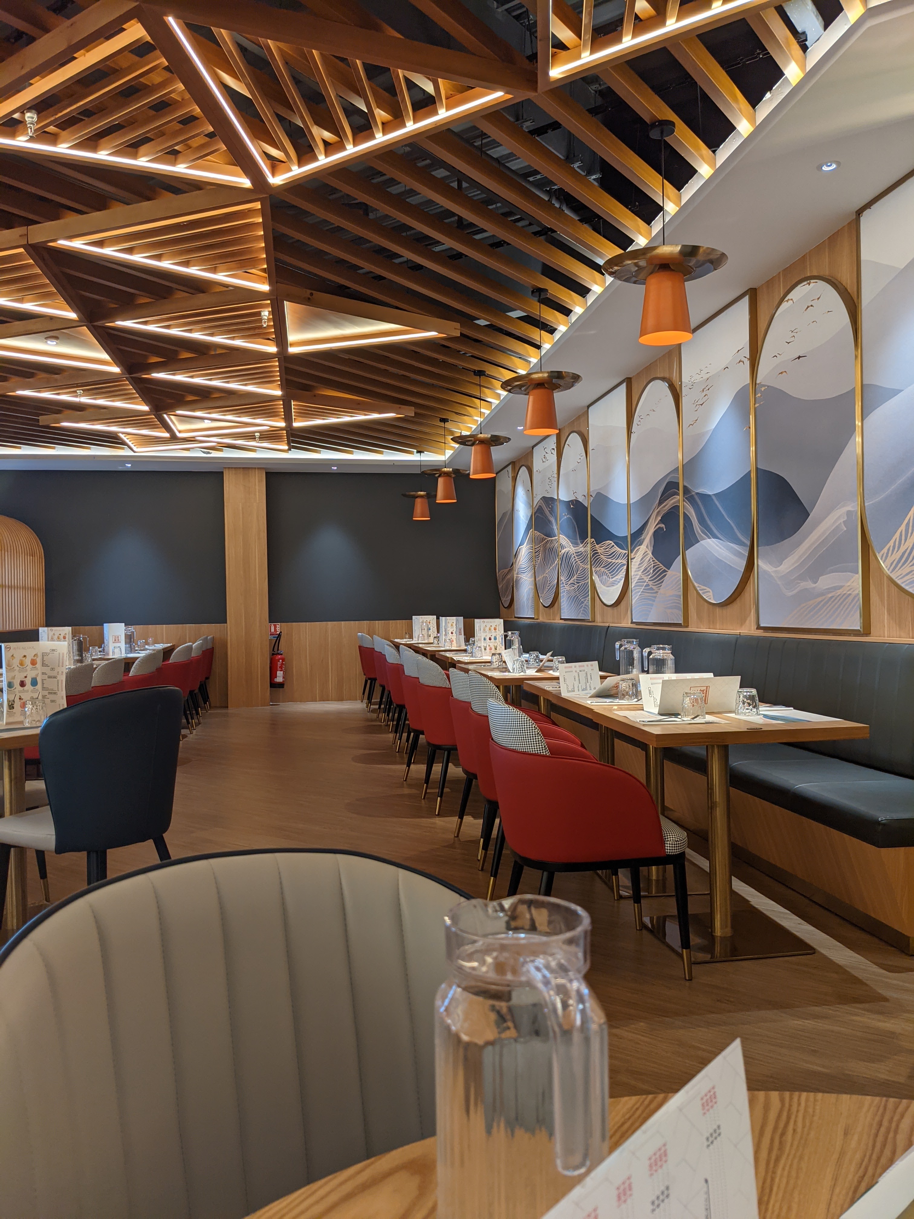 Une vaste salle joliment décorée. Le service est efficace et l'accueil sympathique. On trouve des plats pour tous les goûts : indien, chinois, thaï et des grillades classiques pour ceux qui ne sont là que pour accompagner les amateurs de saveurs exotiques 🙄. Les cuissons sont parfaitement maîtrisées tant pour les viandes que pour le riz. Les plats sont goûteux mais comme d'habitude adaptés aux palais locaux. Les desserts sont un peu inégaux mais originaux. Avec un peu de chance vos boissons seront apportées par le robot mais je l'ai davantage vu transporter des assiettes sales 😏