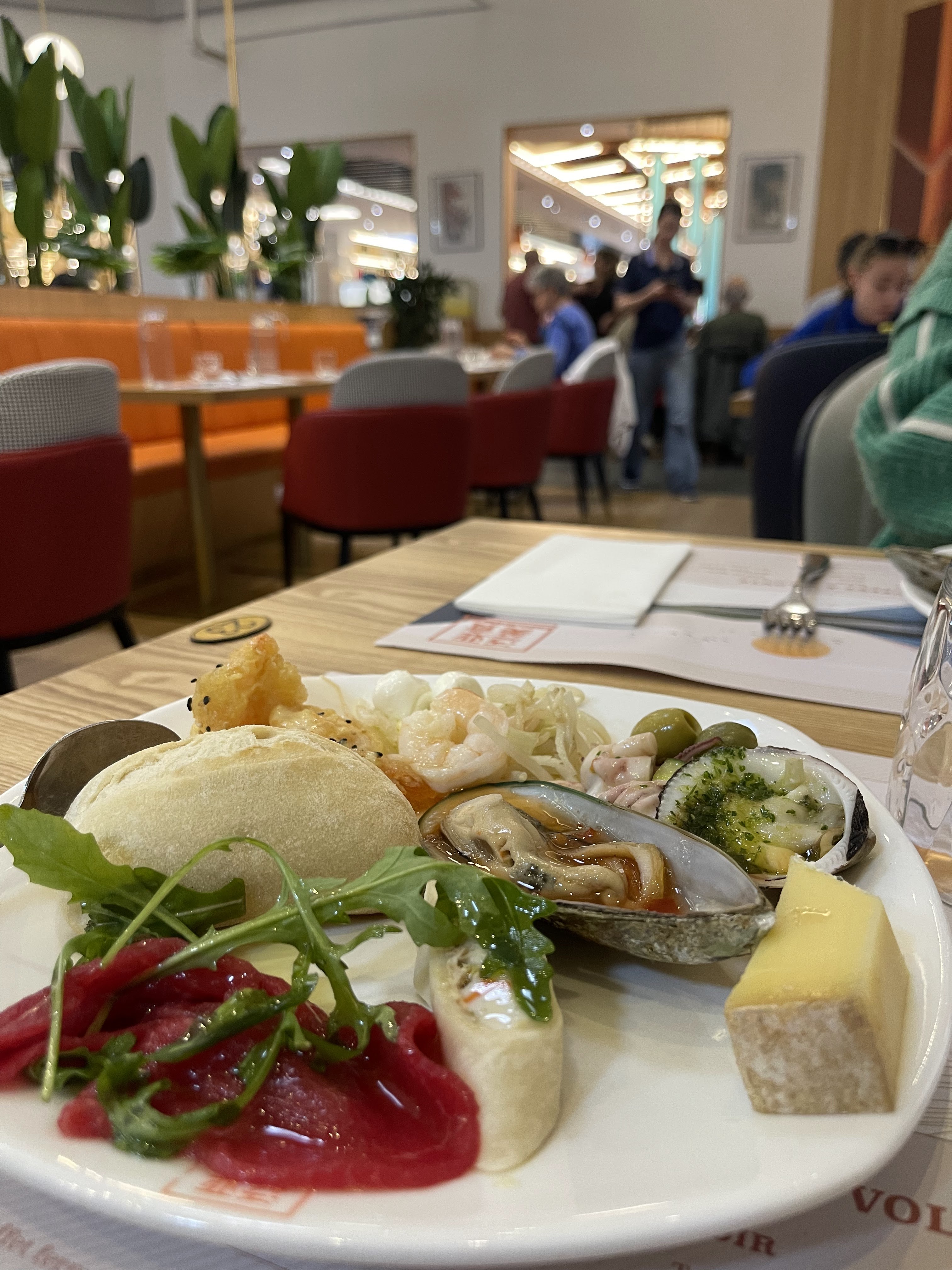 Beau buffet frais très garni malgré notre arrivée tardive (13h30). Le lieu est sobre tout en étant très tendance.