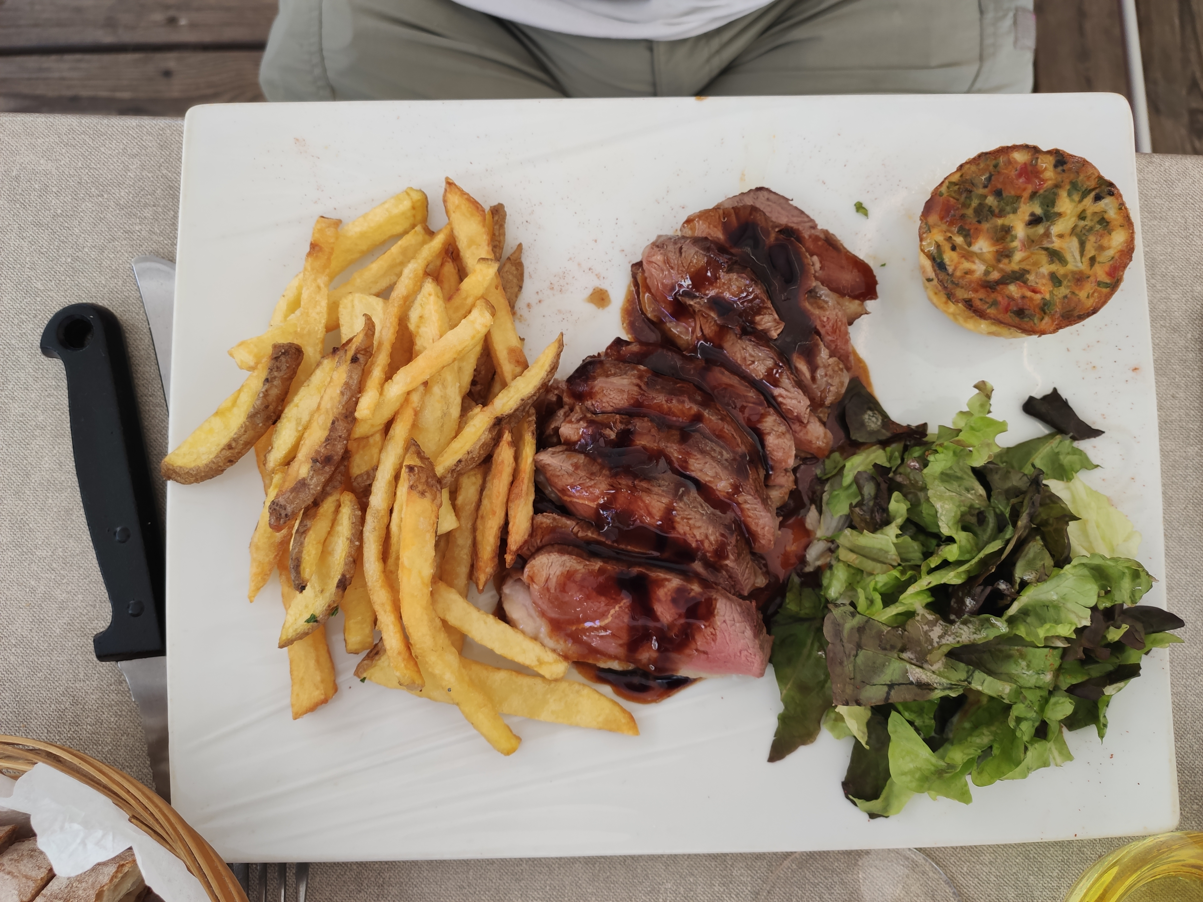 Accueil sympathique, surtout de la jeune serveuse. Menu correct au vu du tarif. L'arrangement du menu avec la pièce de boeuf a été fait sans supplément de prix ce qui est très aimable. Bemol concernant la vente très habile de la demi-bouteille de vin BIO, sans annonce du tarif. La note salée de 32€ pour 50cl de vin rouge du coin, même BIO reste très indigeste, quand le menu est a 31€. Piege classique pour touriste, dommage nous sommes du 06 et nous empresserons de conseiller de ne pas commander sans demander la carte des vins, qui n'est pas affichée à l'entrée évidemment.
