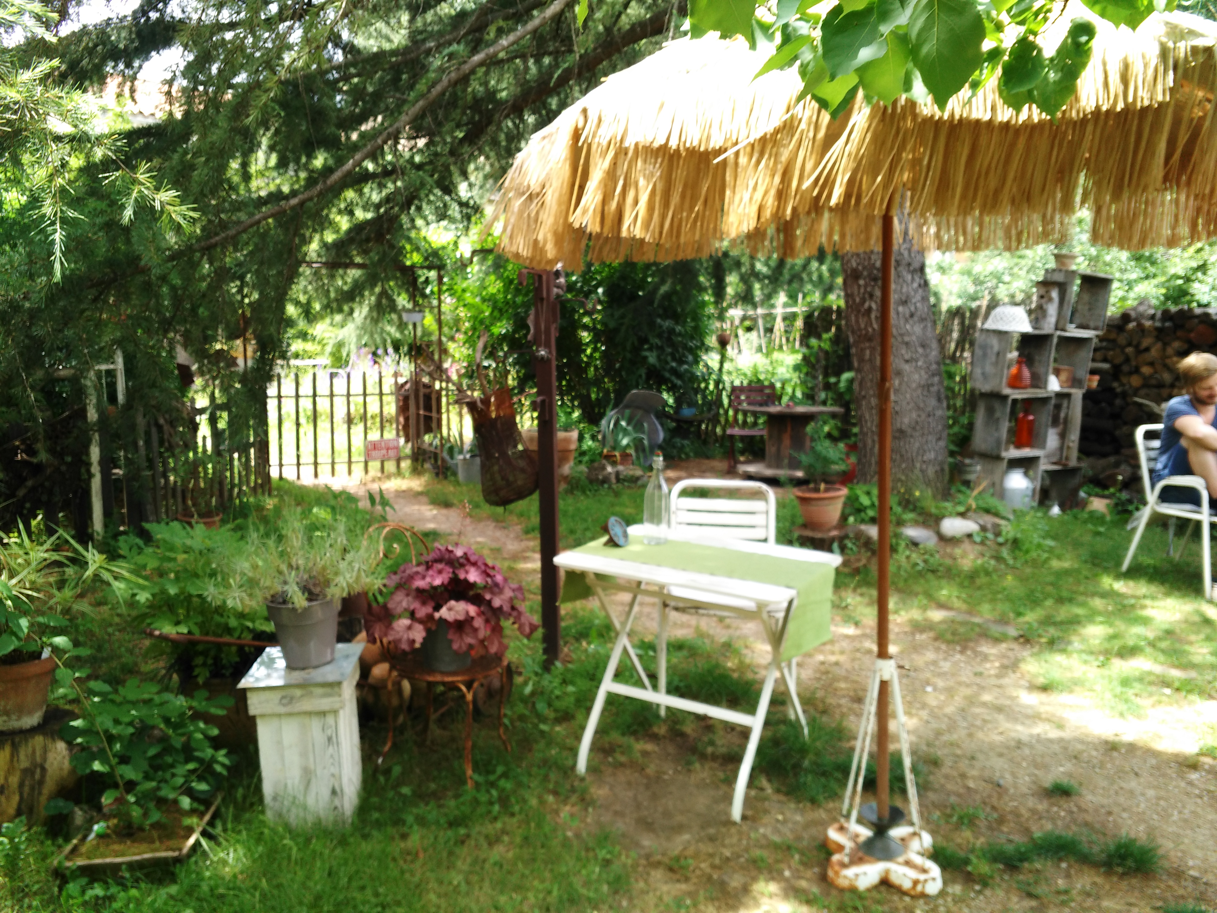 Mignon restaurant dans un jardin intimiste.. bien ombragé et tout pleins d’objets revisités… très bonne cuisine locale , truite fabuleuse et sale de végétarienne excellente .. belle carte de vins locaux .. Isa au service et Val en cuisine.. belle équipe performante .. a découvrir sans hésiter