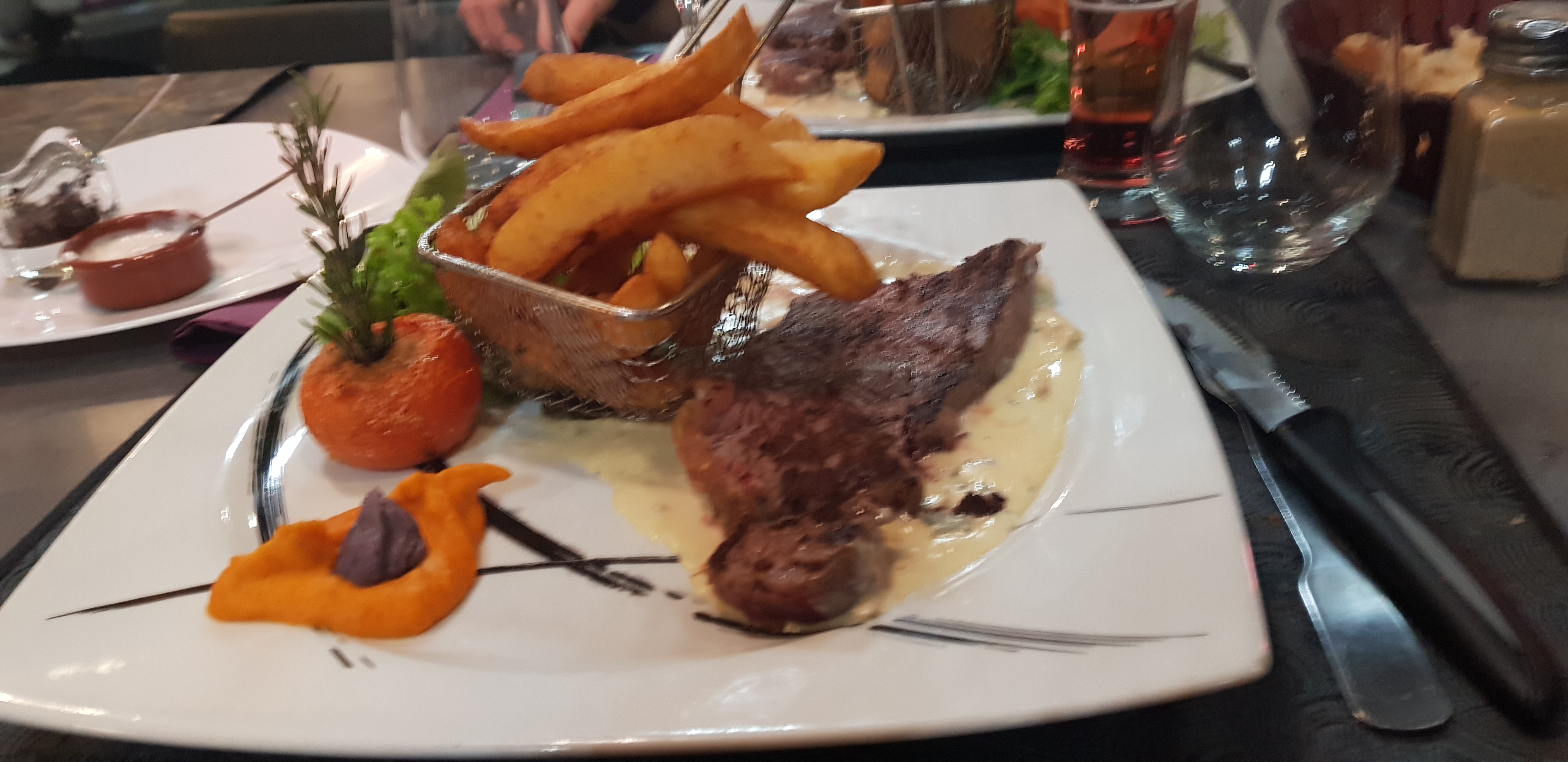 C est la 3ieme fois que nous venons manger dans votre restaurant et la le service a été déplorable , les verres de l apéro ainsi que l assiette de tapenade sont restés sur la table jusqu'à la fin du repas , mon panier de frittes pas bonne car sûrement réchauffé vu leurs consistance très molle est lui aussi resté sur la table jusqu'à la fin. Ma cotte de boeuf ressemblait a une entrecôte vu sont épaisseur et la cuisson ne correspondrait pas a ma demande . En règle générale on mange bien ici mais pas de la viande saignante n y des frites.