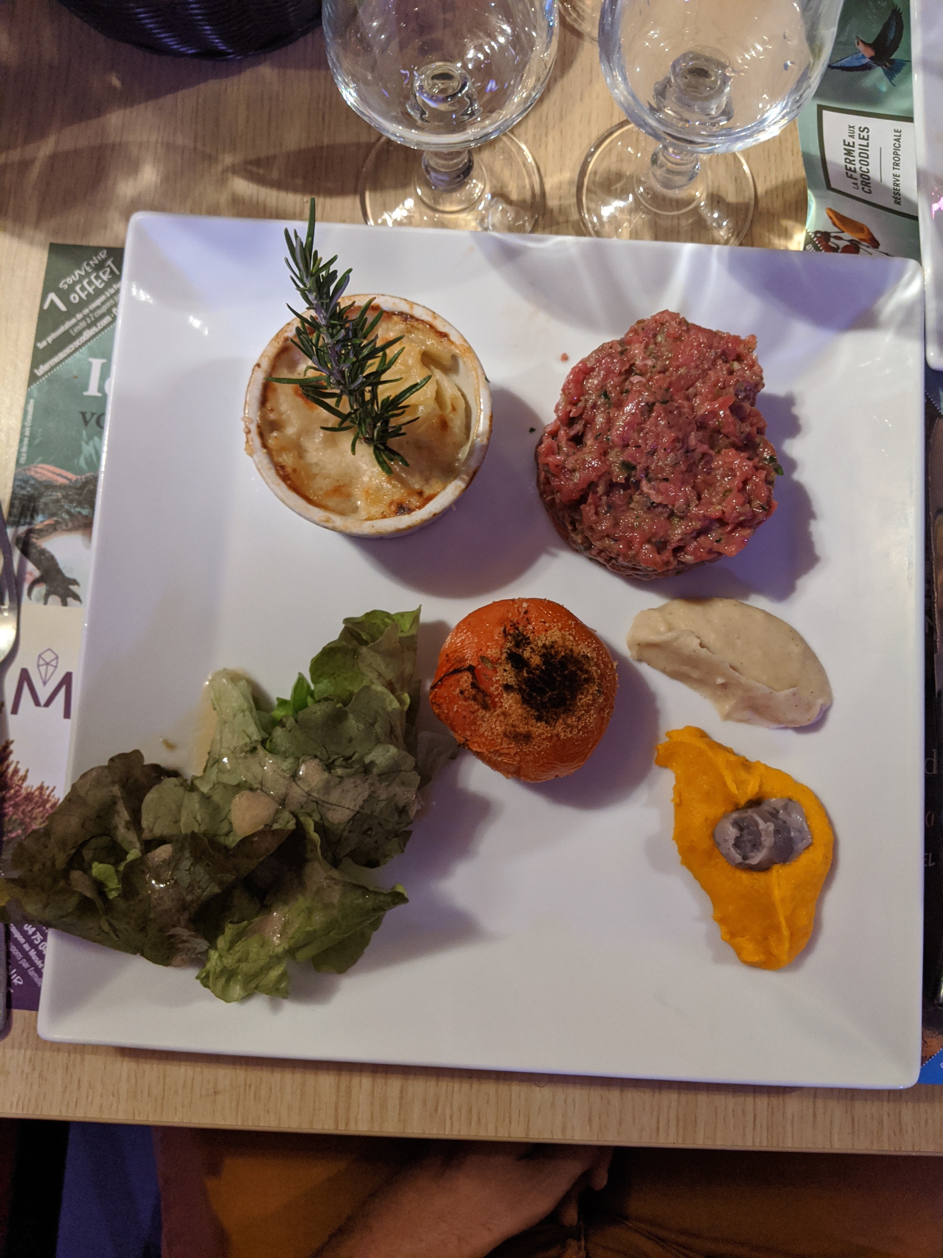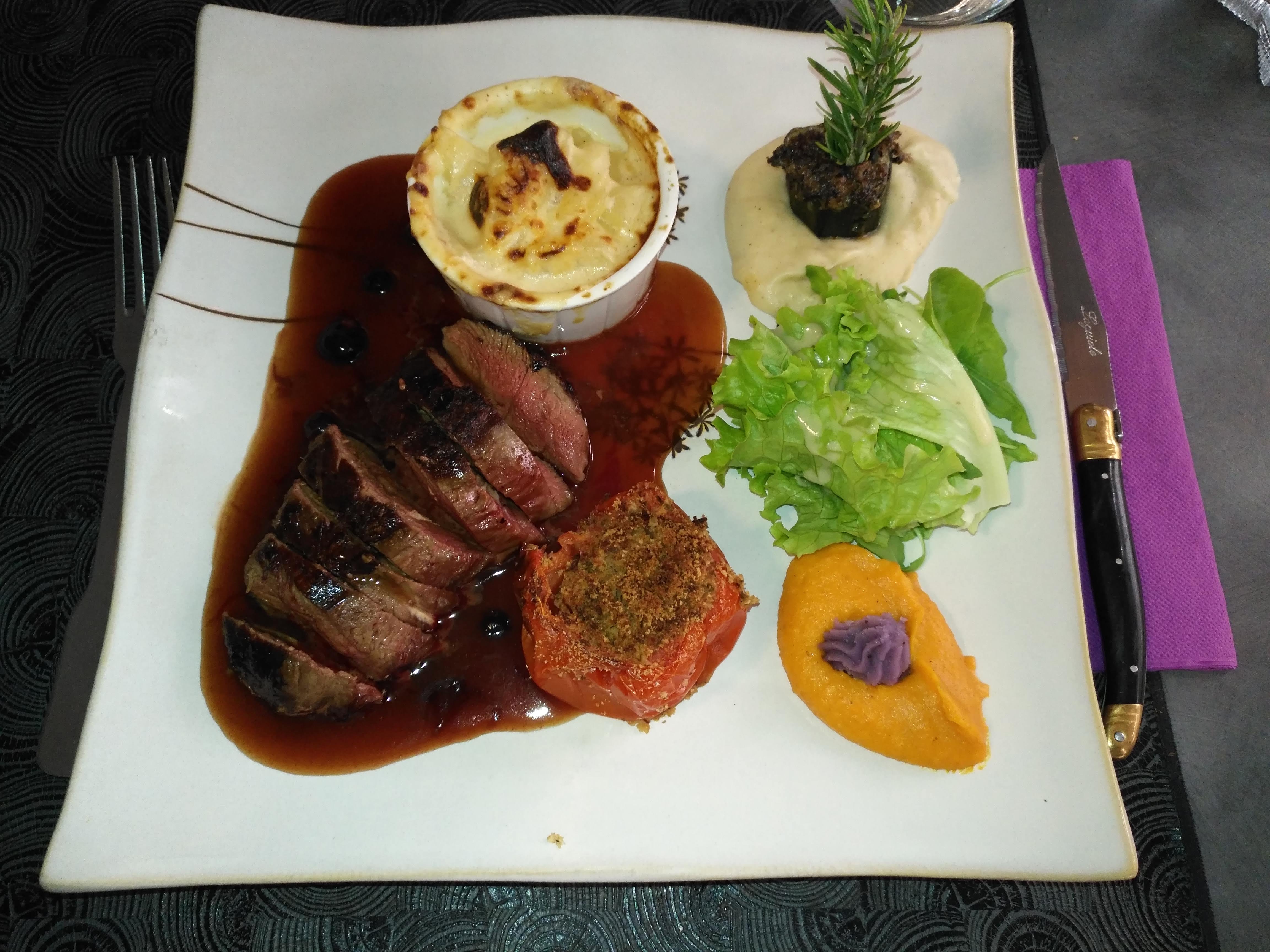 L'accueil est agréable et les plats vraiment bien garnis, on sort pas de table en ayant faim, j'ai pris une salade gourmande avec un morceau de foie gras et du magret fumé, c'était bon mais pas assez pour un restaurant, les croûtons étaient trop grillés, les quelques tomates sans vraiment de goût (bien que nous étions complètement hors saison), j'ai trouvé ça un peu brouillon et moyen. Ensuite j'ai pris un steak tartare, là c'était excellent les quelques purées en accompagnement étaient elles aussi au top, vraiment je conseille ce plat. Pour terminer un fromage blanc et une glace au nougat. Bref un repas bien garnis au service rapide bien que nous étions une quinzaine de personnes.