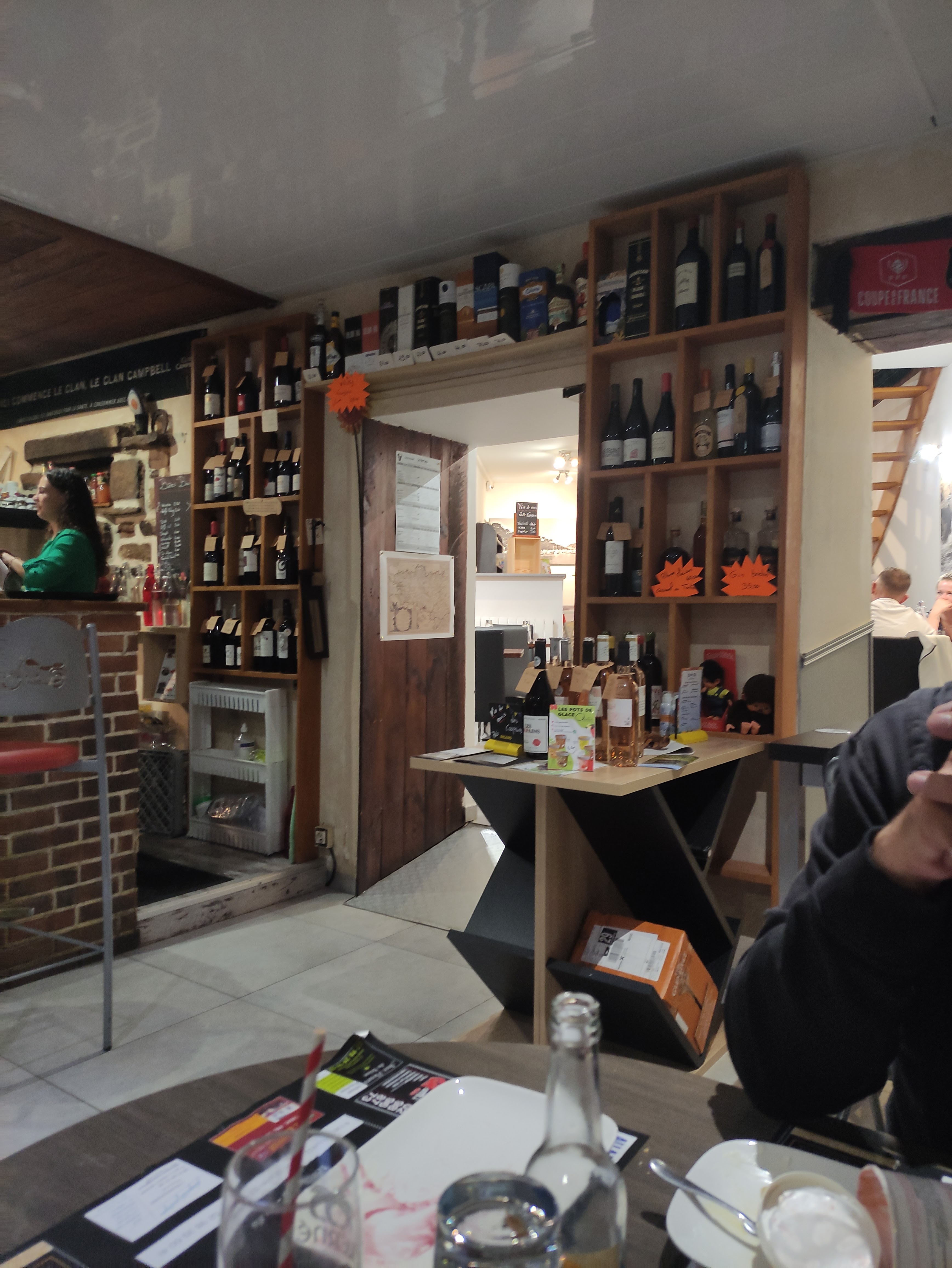 Très bon accueil avec les restaurateurs sympathiques. Dans ce lieu, on peut prendre un verre, déjeuner ou dîner mais aussi acheter du vin ou spiritueux. Nous avons d'ailleurs goûté un nouveau whisky avec super conseils du patron!! Terrasse au ☀️ bien agréable... 🔝 Continuez...👍👋