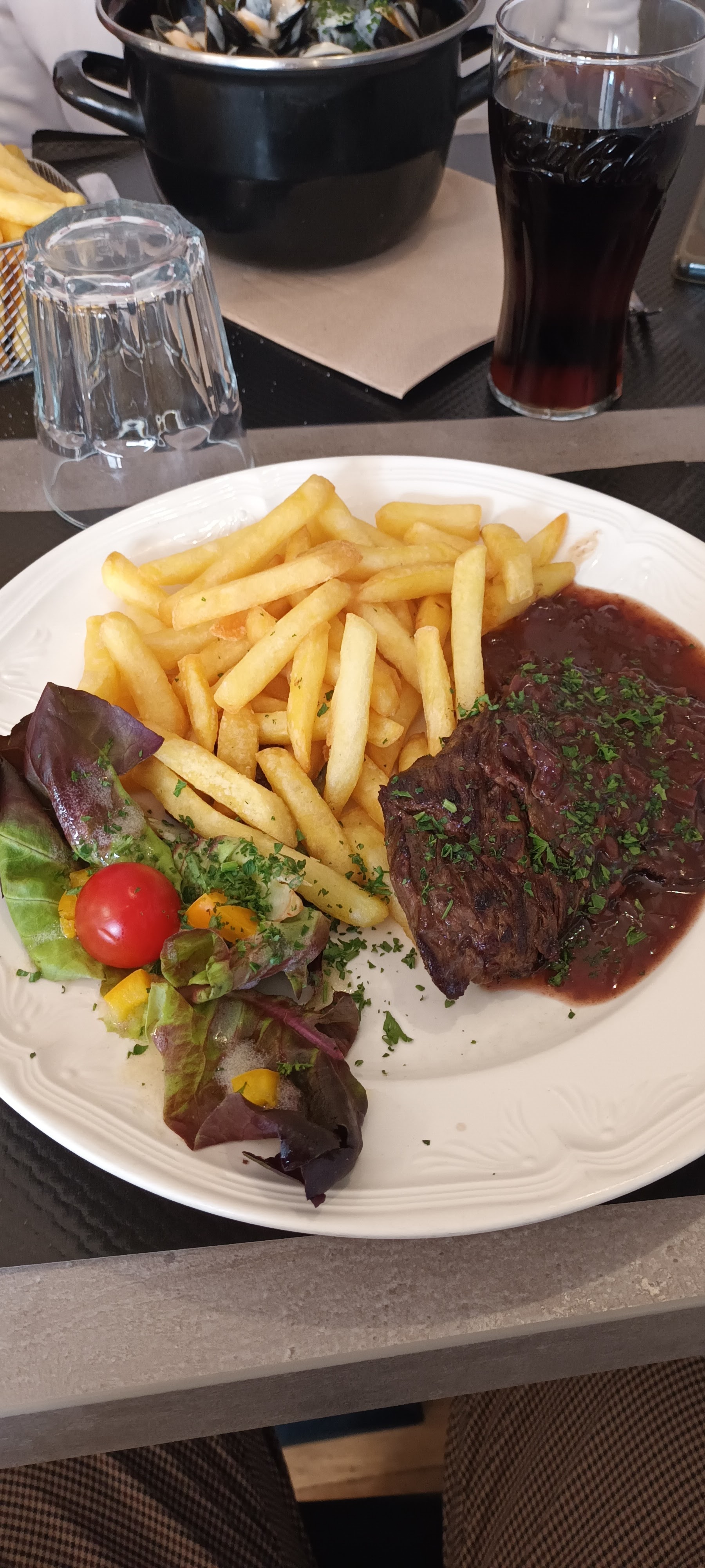 Bavette viande dure ,moules froides,après avoir réchauffé sauce presque inexistante et collée à la paroi du plat.Personnel très sympas !!