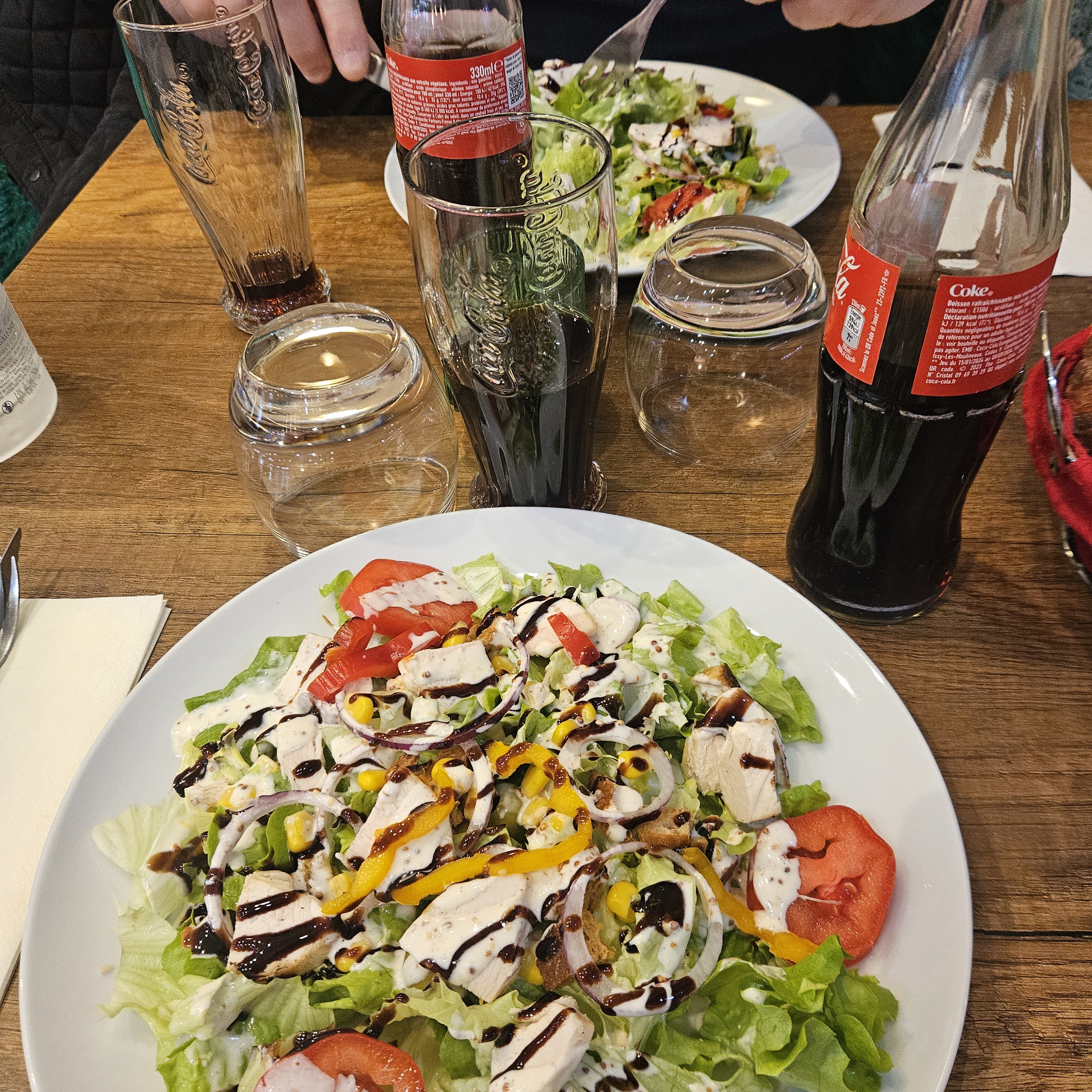 Salade lyonnaise avec beaucoup de verdures et de croutons, lardons rares et un tout petit oeuf pour 14 € vraiment cher pour la qualité, Une salade césar petite avec du poulet trop sec à 9€ puis une pizza chèvre miel sur base tomates de piètre facture, pour couronner le tout un pot de rosé à 10 € moyen donc cher, Et deux cafés Décaféinés carrément imbuvables que nous avons laissé, total 54,50€ , très déçu de ce restaurant.