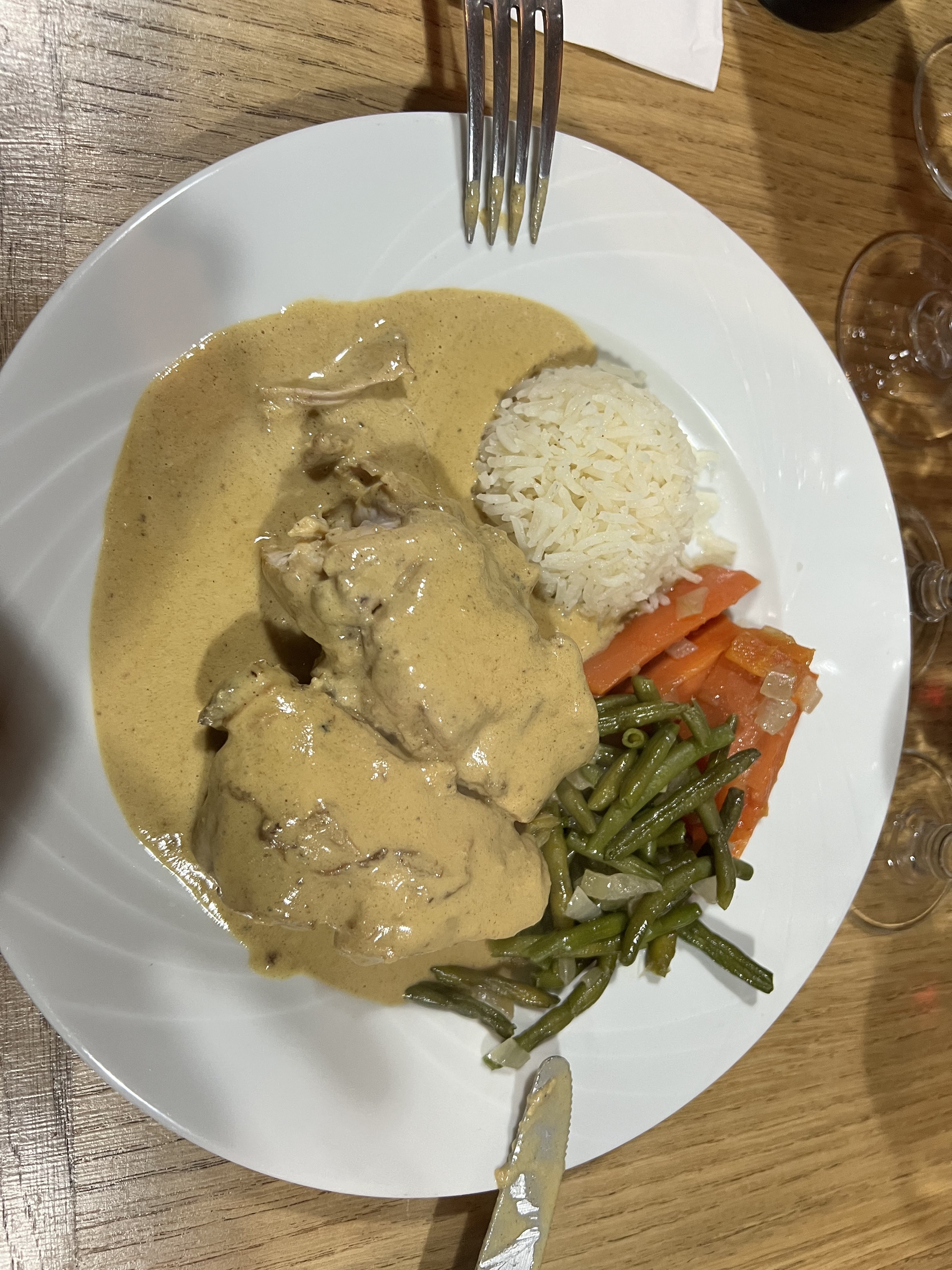 Un de nos plats préférés de toute la semaine. Le personnel était incroyablement sympathique et accueillant, la nourriture était délicieuse et le restaurant avait une petite ambiance de taverne confortable. J'ai eu la fricasse de poulet (photo) et je la récupérerais sans hésiter. La sauce était incroyable. Nous avons tous eu un plat différent et aucun d'entre nous n'est parti en souhaitant avoir quelque chose de différent, car chaque plat était si savoureux. Recommande fortement!