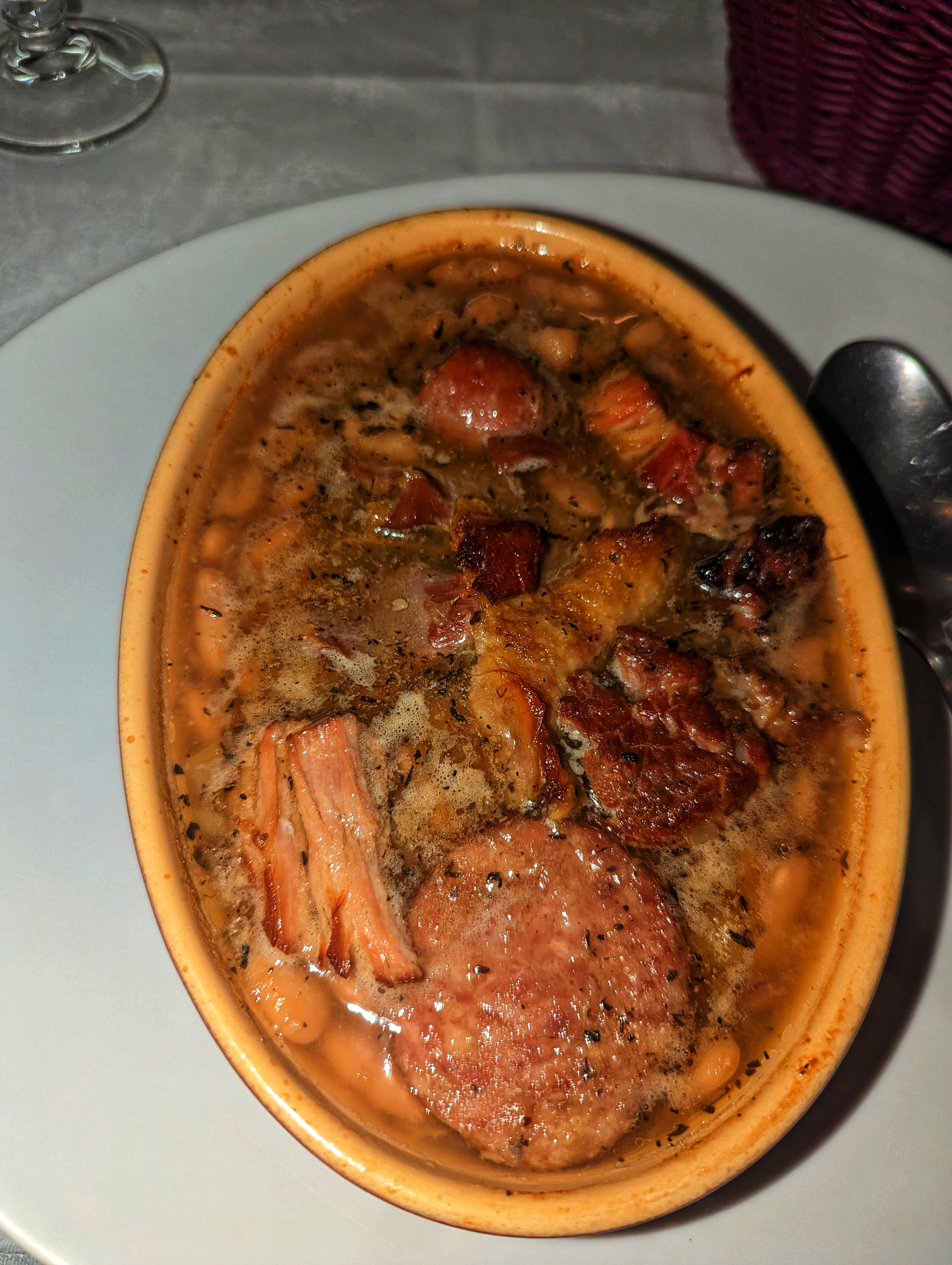 Eh bien, j'ai choisi cet endroit à cause des critiques sur Google. J'ai commandé une soupe à l'oignon en entrée, c'était décevant. J'ai commandé du Cassoulet Maison pour le plat principal. Je suppose que ce n'était pas ma nourriture. Je n'ai pas apprécié. Le restaurant était petit et plein à craquer. Pas d'espace entre les tables.