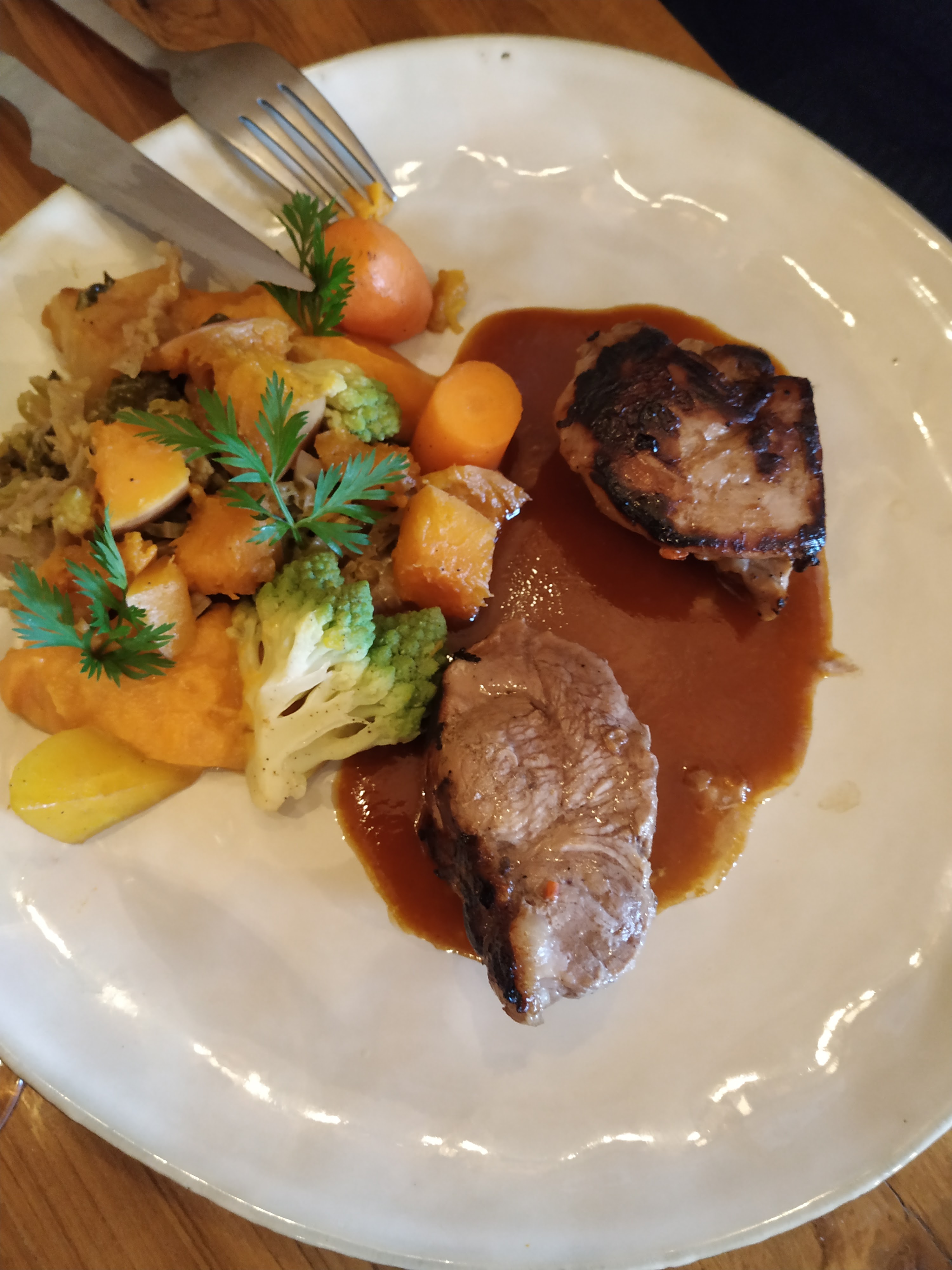 Bon service, nourriture bien cuisinée, ambiance charmante et rustique.