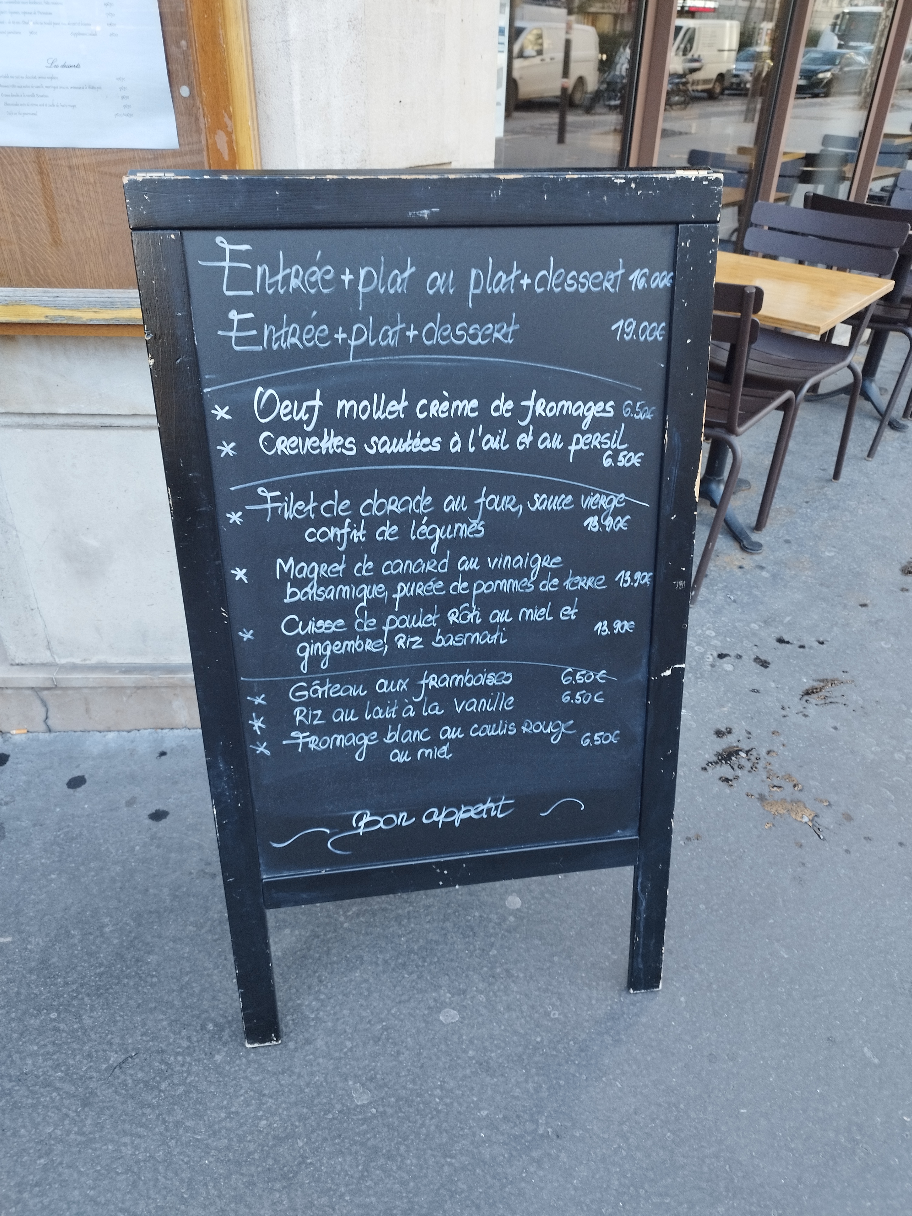 Excellent menu entree-plat-dessert à 19€ pour le déjeuner. Bonne qualité, service souriant. Imbattable à Paris!