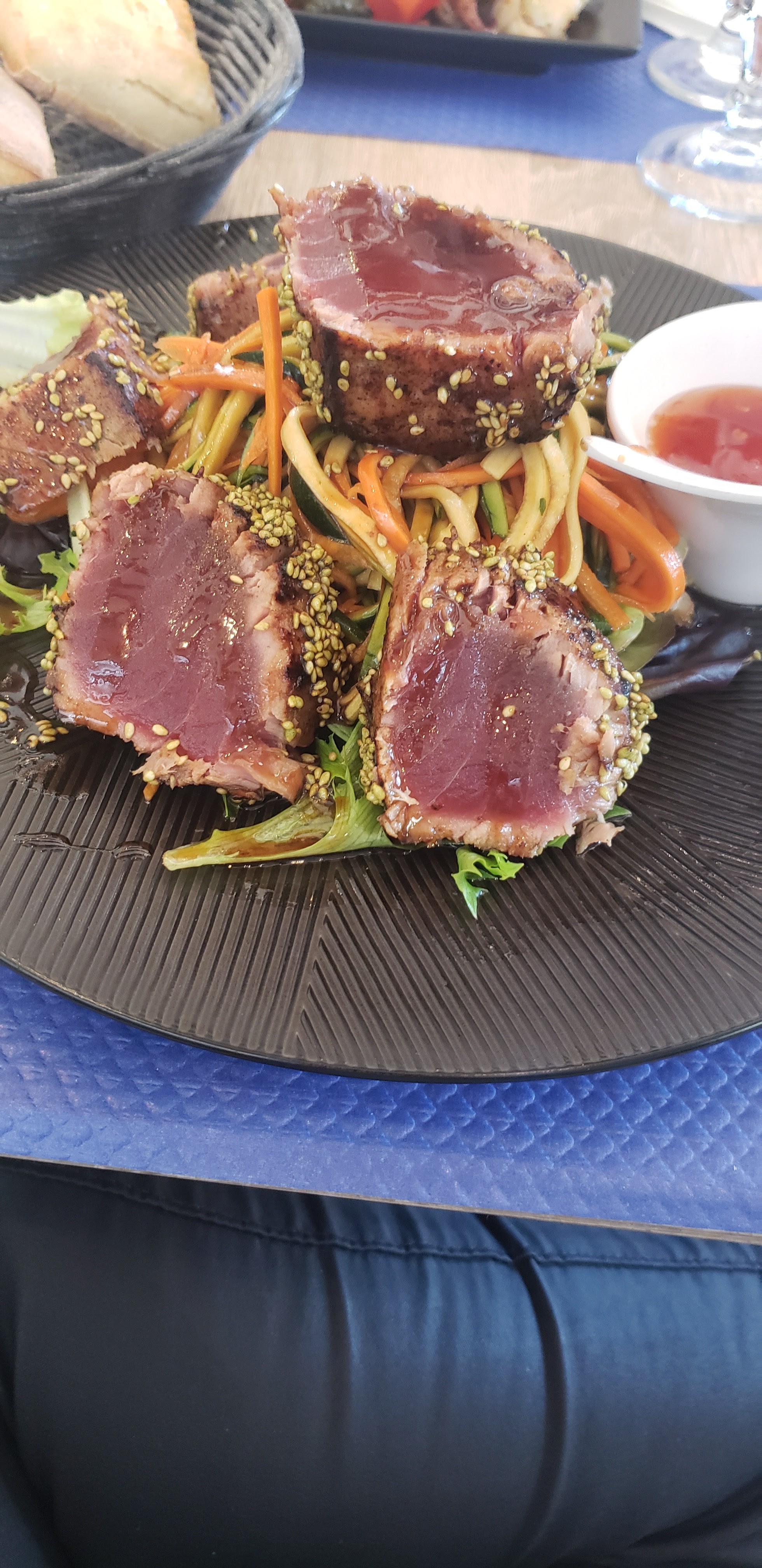 De passage dans la région nous nous sommes arrêtés dans ce restaurant nous ne sommes absolument pas déçu de la qualité des repas du service et y compris de l'ambiance Tout y est copieux les prix sont très raisonnables. C'est tellement agréable et bon que nous y retournons mardi midi et là nous prendrons des photos pas besoin d'ajouter que nous recommandons vivement et avec du bon sens ce restaurant allez-y les yeux fermés mais pas trop et la bouche ouverte bon appétit Mardi 26/09/23 Chose promise chose due nous y sommes retournés voici deux photos la première trio de tartare saumon - poulpe et thon pour moi Poulpe Grillé ou le contraire houps! pour ma Femme un régal courrez vite. Nous y retournons demain pour tenter de déguster des sardines ou des rougets grillés à défaut un loup (mulet) grillé. Vous comprenez que nous adorons les produits de la mer, si vous êtes comme nous allez-y ne vous privez pas de toutes ces bonnes choses bonnes pour la santé c'est bien servi et succulent bon appétit Mercredi 27/09/23 Comme prévu nous y sommes retournés mercredi et nous avons dégusté de très bon rouget grillé bon on vous a mis des photos on avait déjà commencé aller manger j'avoue qu'on avait très faim, absolument pas déçu comme les jours précédents nous rentrons chez nous dans l'Allier avec le ventre bien rempli. A J'allais oublier nous y reviendrons certainement dans un prochain voyage dans cette région, si vous y passez avant nous laissez-nous votre avis. J'ajoute les photos des rouget grillé
