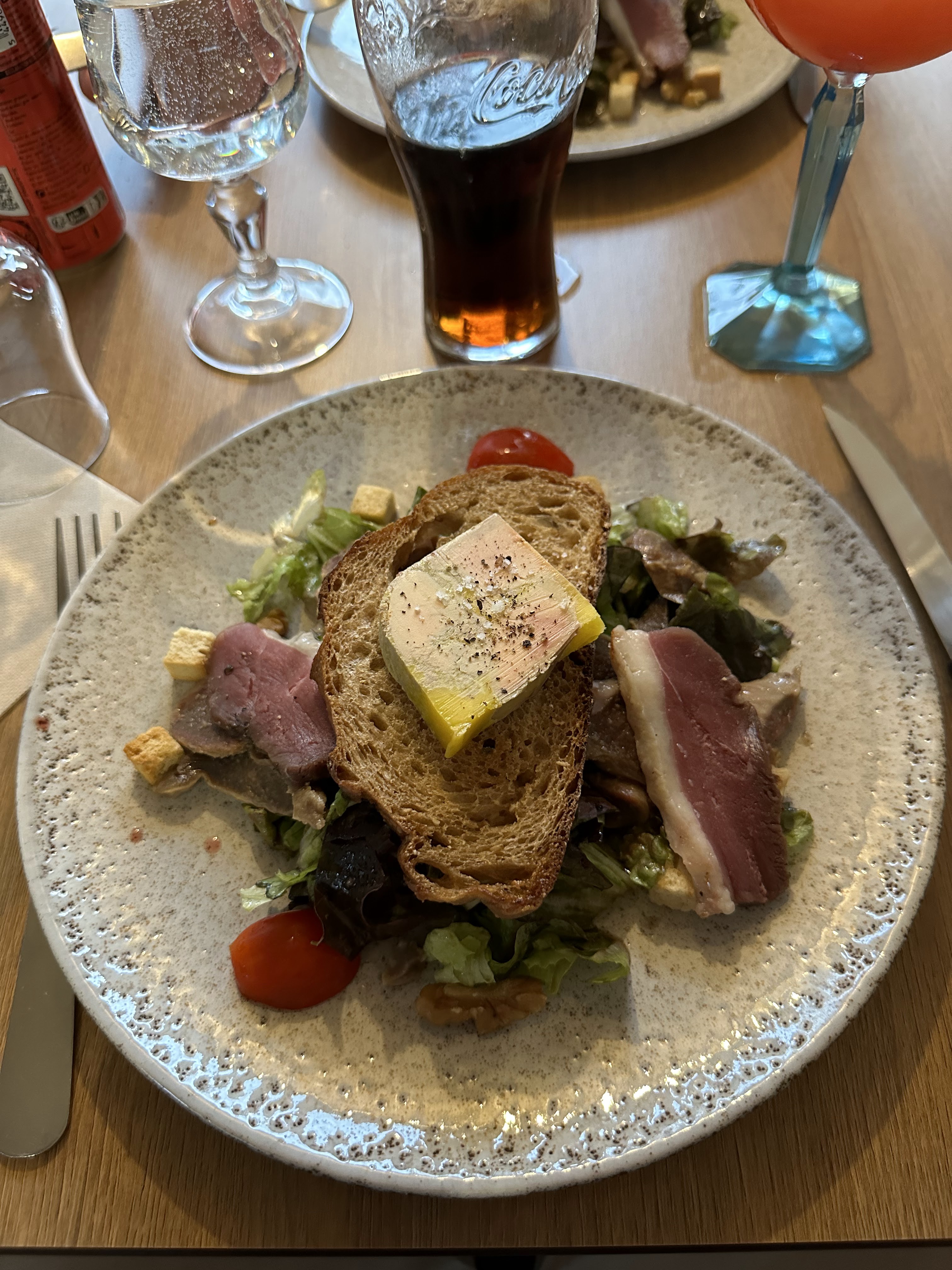 Aux cèpes désenchantés. Des verres apéritifs en plastique. Déjà ça refroidit, si je puis dire, vu la température extérieure. Et l apérol revisité qui n'a le goût de rien de bon. Servi avec 3 curly. Une salade avec de bon petits croûtons bien carrés tout droit sorti d'un paquet de croûtons de supermarché. Suivi de l aiguillette de canard pas trop mal cuite mais avec des frites surgelées et des cepes juste réhydratés un bonheur. Trop de bonheur. On se demande juste d où viennent tous ces commentaires tellement positifs qui nous ont poussés à venir dîner ici.... un piège à touristes.