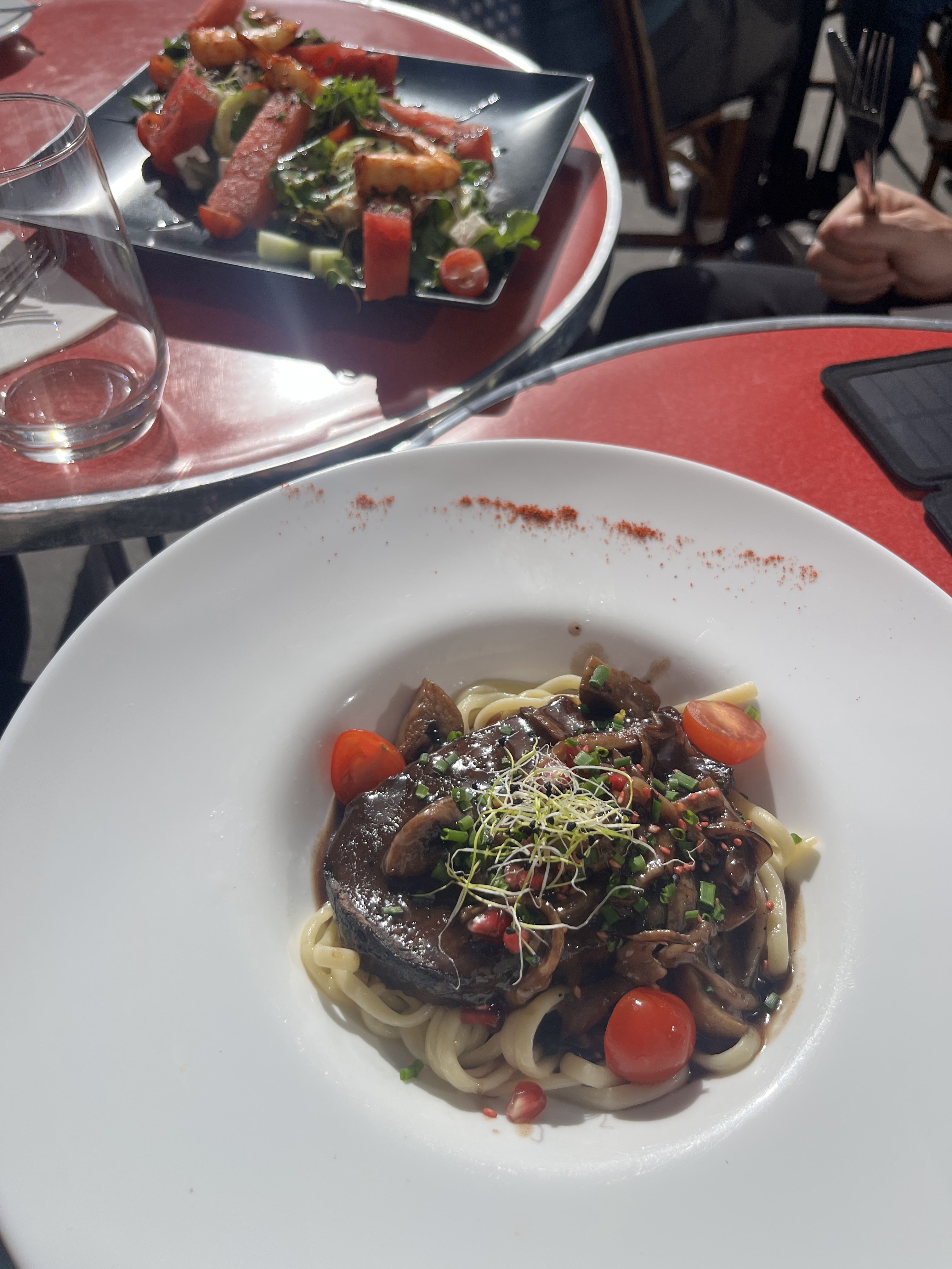 Un de nos plats préférés à Paris. Tout était cuit à la perfection, le steak était délicieux et la salade de pastèque et de crevettes si fraîche et parfaite pour une journée chaude. C'était l'un de nos repas les plus chers mais ça valait le coup ! On pouvait dire que toute la nourriture était d'une qualité incroyable.