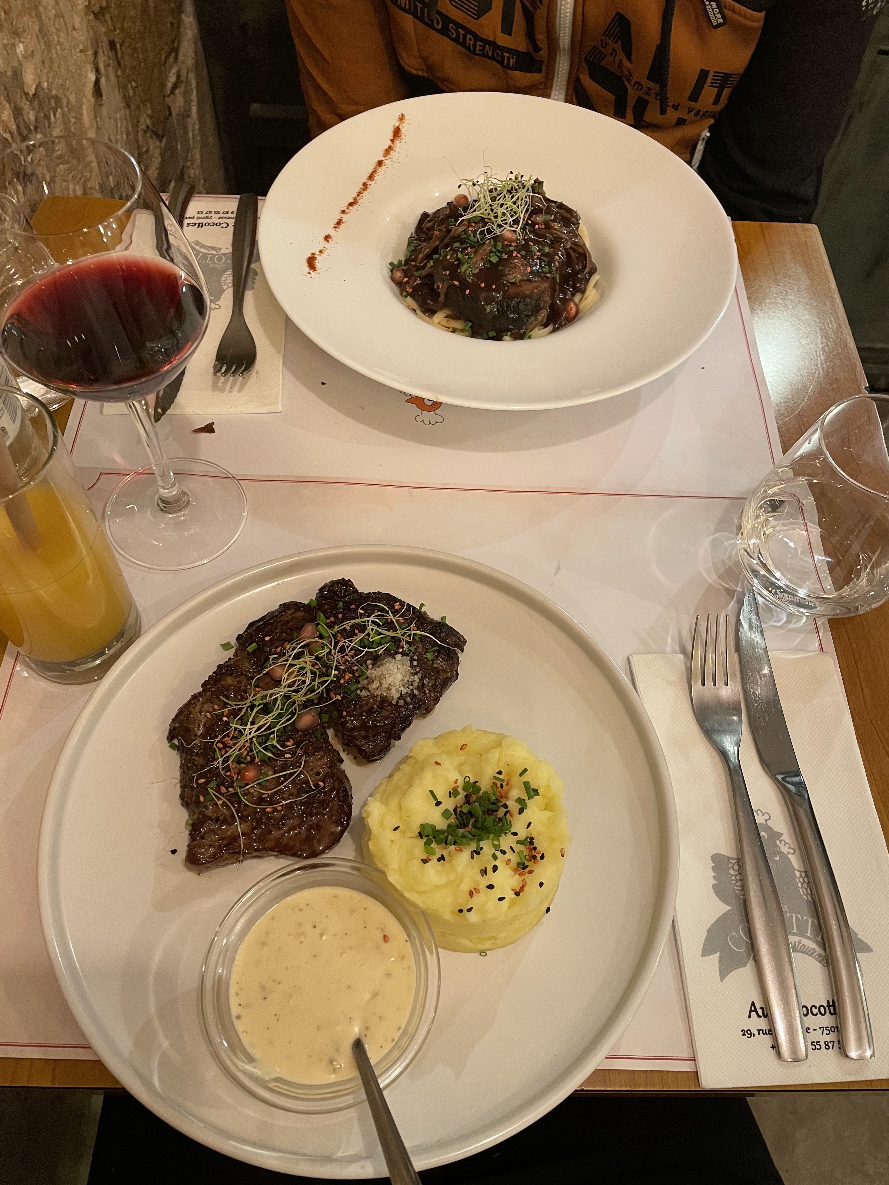 En entrant dans le restaurant, vous serez agréablement surpris par son ambiance captivante et son décor intéressant. Le personnel est incroyablement sympathique et s'efforce de répondre rapidement à vos demandes. Le faux-filet était préparé à la perfection, avec une viande magnifiquement cuite, accompagnée d'une purée chaude et onctueuse. Le paleron de bœuf était tout aussi impressionnant, fondant en bouche et débordant de saveurs. Je recommande vivement cet endroit pour une expérience culinaire exceptionnelle !