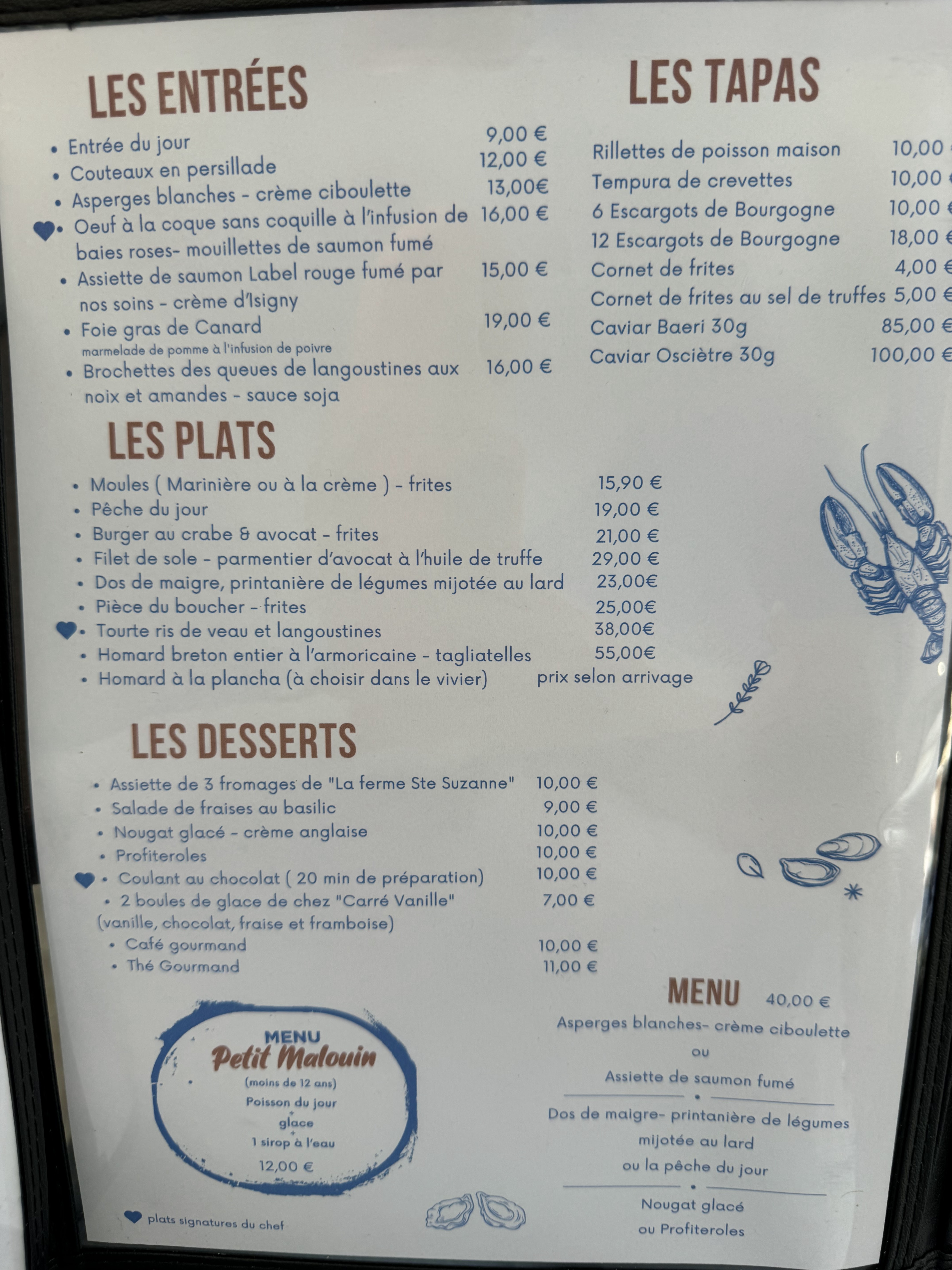 Nous avons passé un bon moment escargots, carats de crevettes, un homard pour deux repas délicieux accompagné d un verre de vin blanc le petit marin et les serveuses sont charmantes ainsi que le patron merci