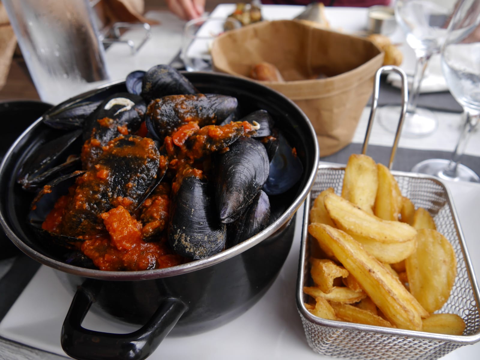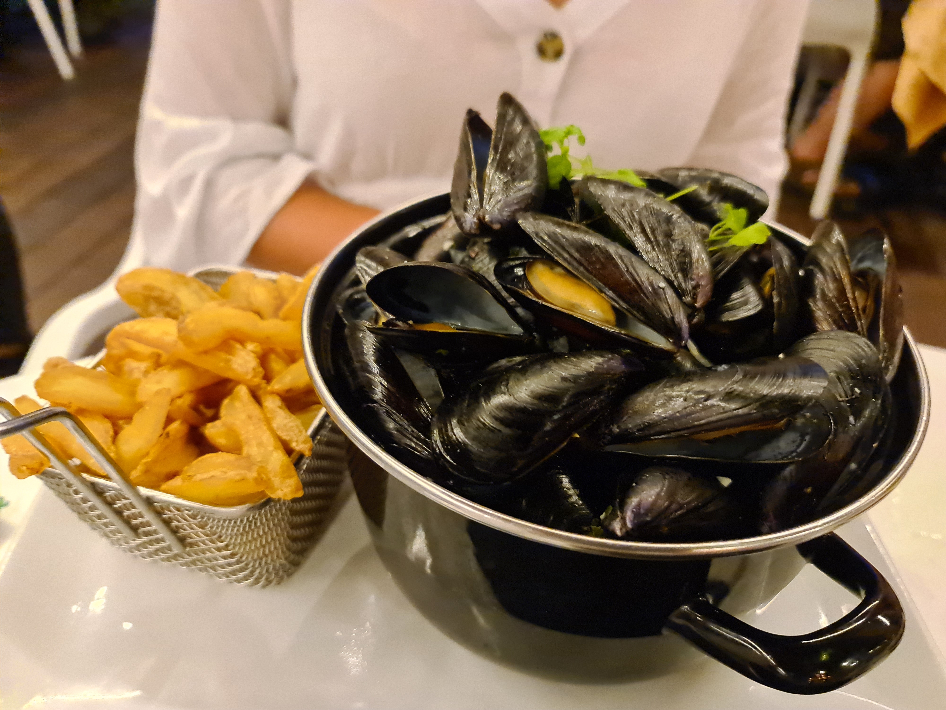 Nous étions à peine en train de boire notre appétit avec les toasts de tapenade que le serveur nous a amené notre plat donc le temps de finir l appero mes frites froides mes moules froides enfin très déçu 😞 et pour moi le tarif est un peut execif