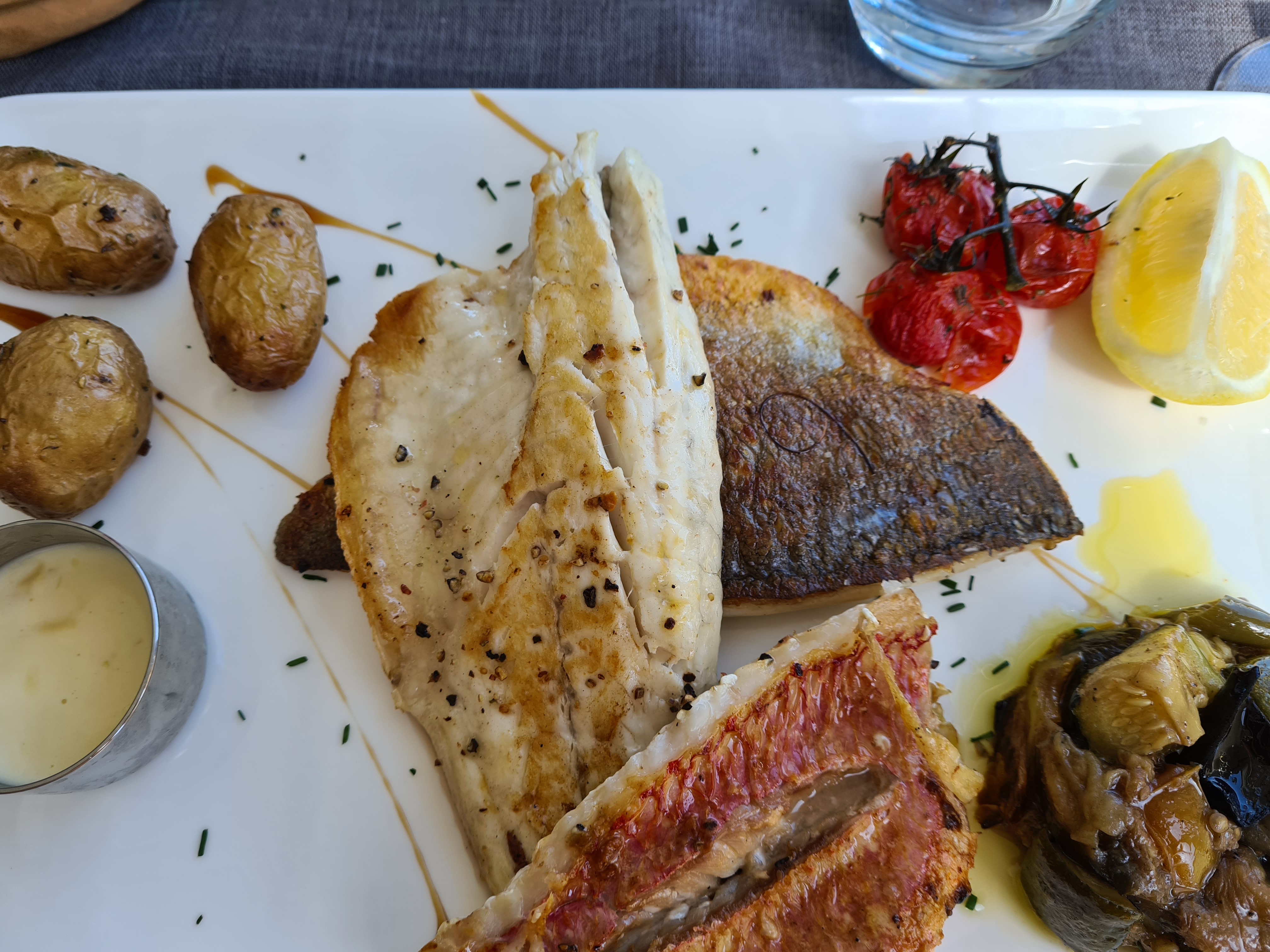 Nous nous sommes régalés avec cette Dorade entière à partager, découpée devant nous. L’accompagnement était tout aussi bon. En dessert, le baba au Rhum au Limancello était extra !
