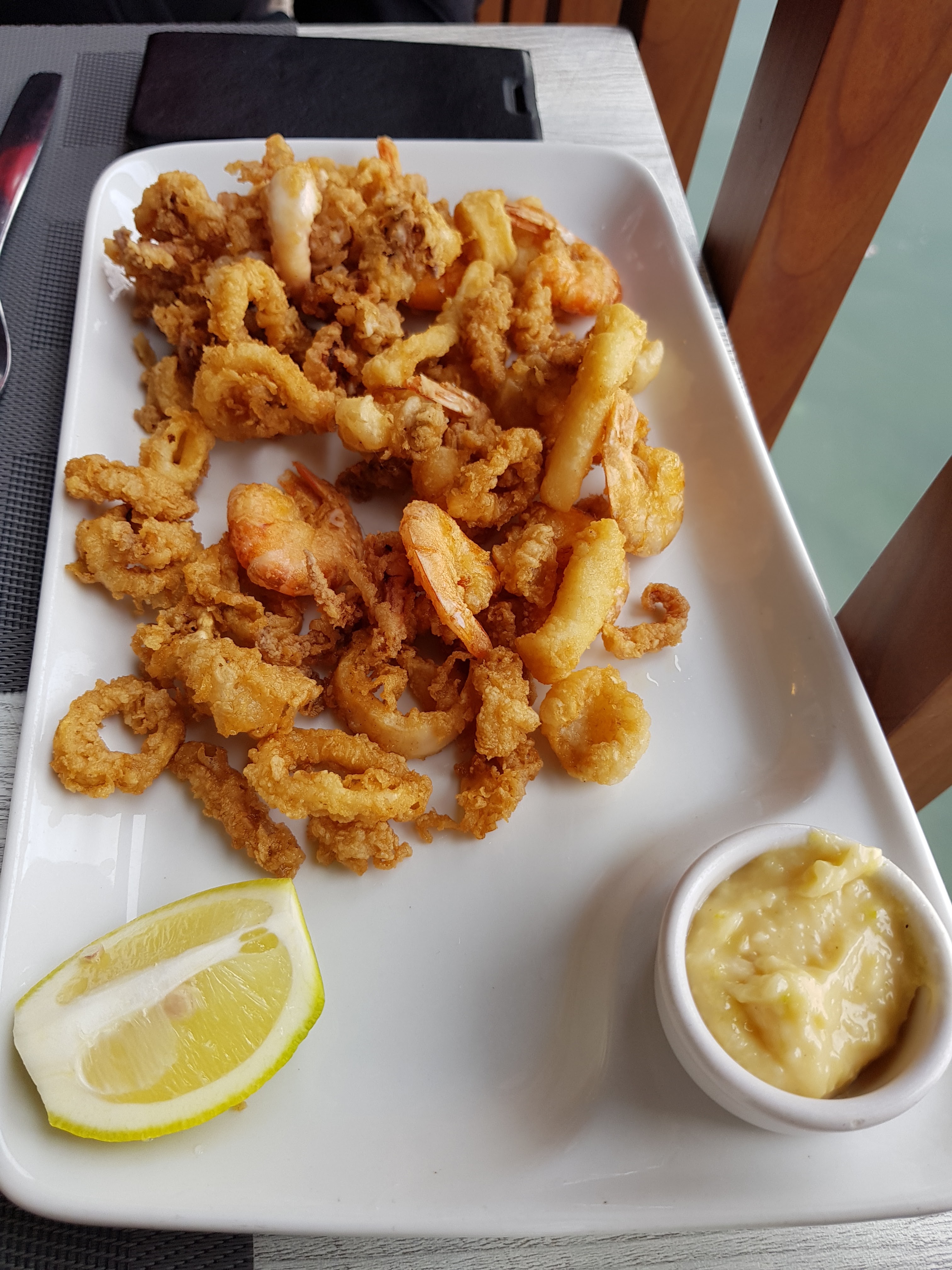 Restaurant très classe. La gérante très élégante (ainsi que les serveurs). Vous appréciez l'accueil et l'hospitalité de tout le monde. Le cadre est très agréable au bord de l'eau, les tables, les nappes, les assiettes... Tout est beau.. Quant aux plats, vous allez vous régaler. Pour tester on a presque tout pris :)) - salade de poulpes : delicieuse - fritures de fruit de mer... Exceptionnelle - les plats de poisson frits que ce soit rouget ou trio c'est bien copieux :) - essayez aussi les pâtes à l'encre de sèche... - même les nuggets du menu enfant (oui j'ai goûté :)) sont vraiment spéciaux... Avec du sesame - assiette de fruits (c'est local et délicieux) - Tiramisu : pas très exceptionnel mais la crème est bien faite maison Je donne 5 étoiles sans prob Attention il faut réserver.