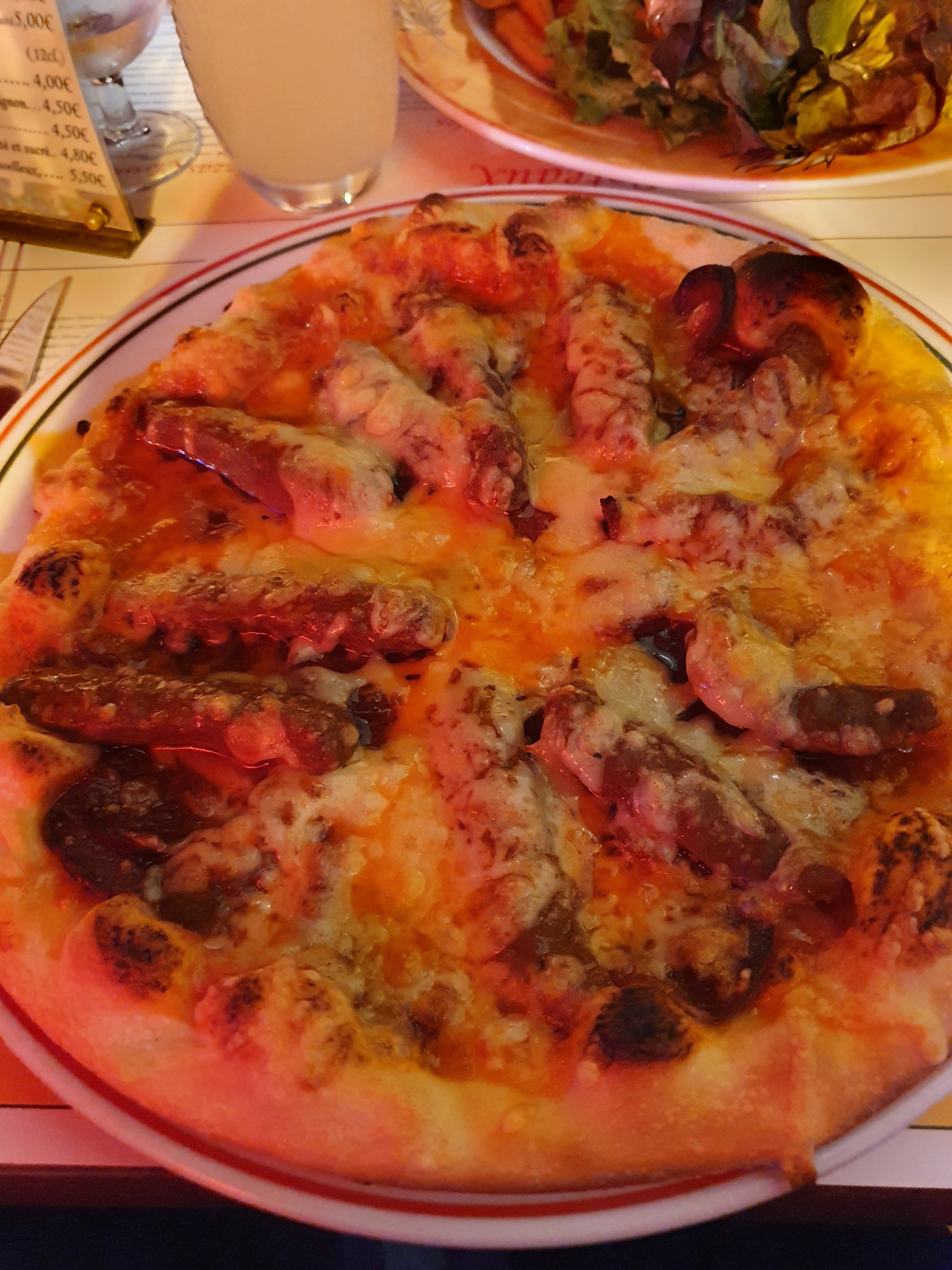 Amateur de sensations forte vous êtes à la bonne adresse. La pizza au saumon est comme un manège, une montée fulgurante mais une descente faramineuse ! Je n’ai jamais mangé une pizza comme celle ci. Vous allez fortement apprécier les nuances de saumon et d’œufs de lympe périmés (la sauce piquante pas besoin, la pizza pique déjà). Pour une pizza aussi petite et aussi chère foncé !