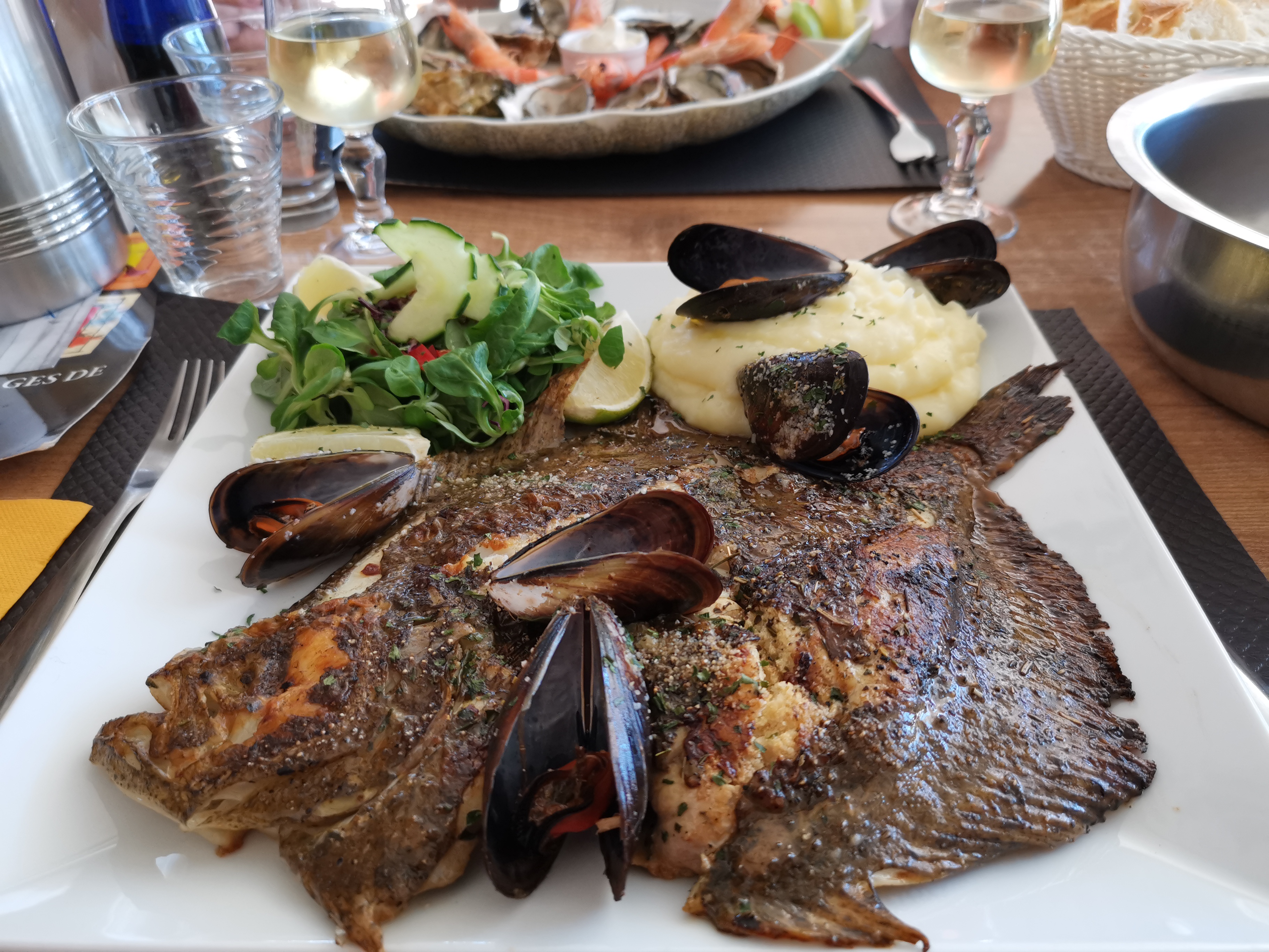 Excellent poisson servit avec une très bonne purée, de la salade et quelques moules très goûteuses en accompagnement !!! Apéritif, vin et dessert