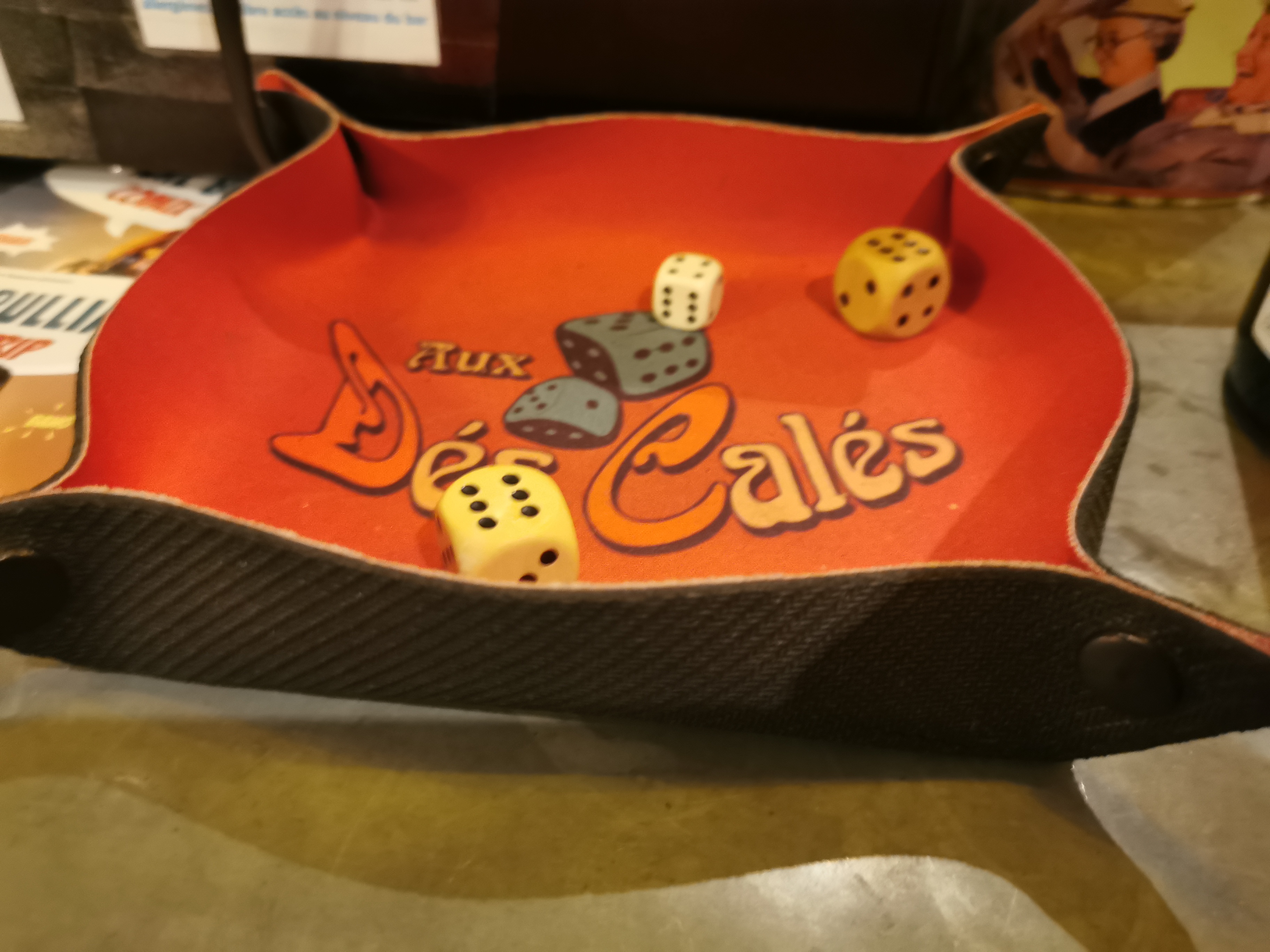 Aux Dés Calés, vous trouverez l'endroit idéal pour boire un verre de votre choix ou déguster un met savoureux. La chaleur du lieu ravive les coeurs et l'équipe vous donne le sourire. Il est également possible d'organiser des évènements en réservant la grande salle du fond. De surcroît, l'établissement possède des centaines de jeux de société auxquels il est possible de jouer. Un animateur est présent pour vous aider à passer un moment convivial entre amis. N'hésitez plus, ouvrez la porte.