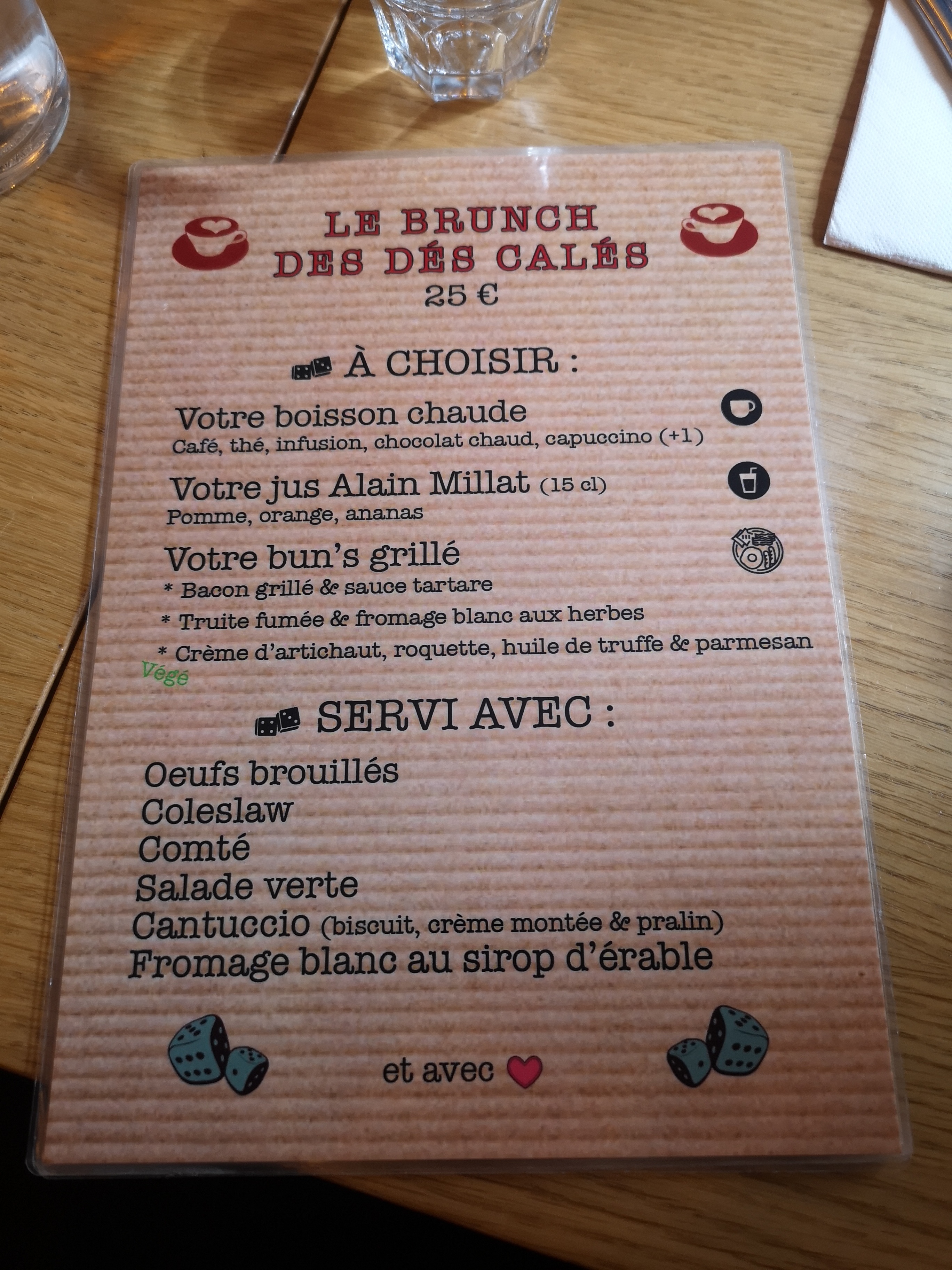 J'ai passé une très bonne soirée aux dés calés, très bon produit au restaurant et le must les jeux de société disponibles pour finir la soirée.
