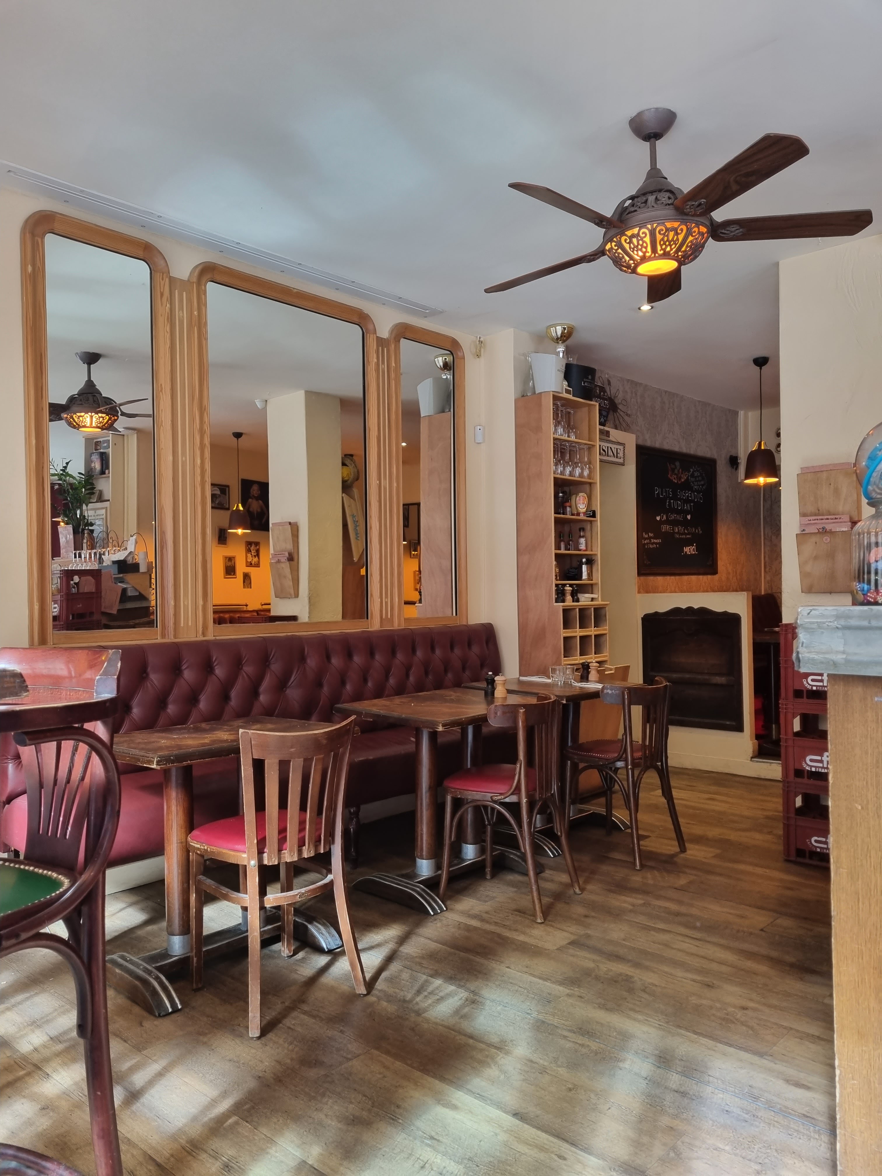 Je fréquente ce café tous les jours depuis quelque temps pour l'excellente bande son de Charles, l'ambiance, l'atmosphère, les jeux, les cafés et plats suspendus pour ceux et celles qui ne peuvent payer et la présence chaque jour du journal le parisien. Tout le monde se connaît tout le monde se tutoie. Par ailleurs, la nourriture est excellente, la terrasse spacieuse, les voitures rares. On adore.