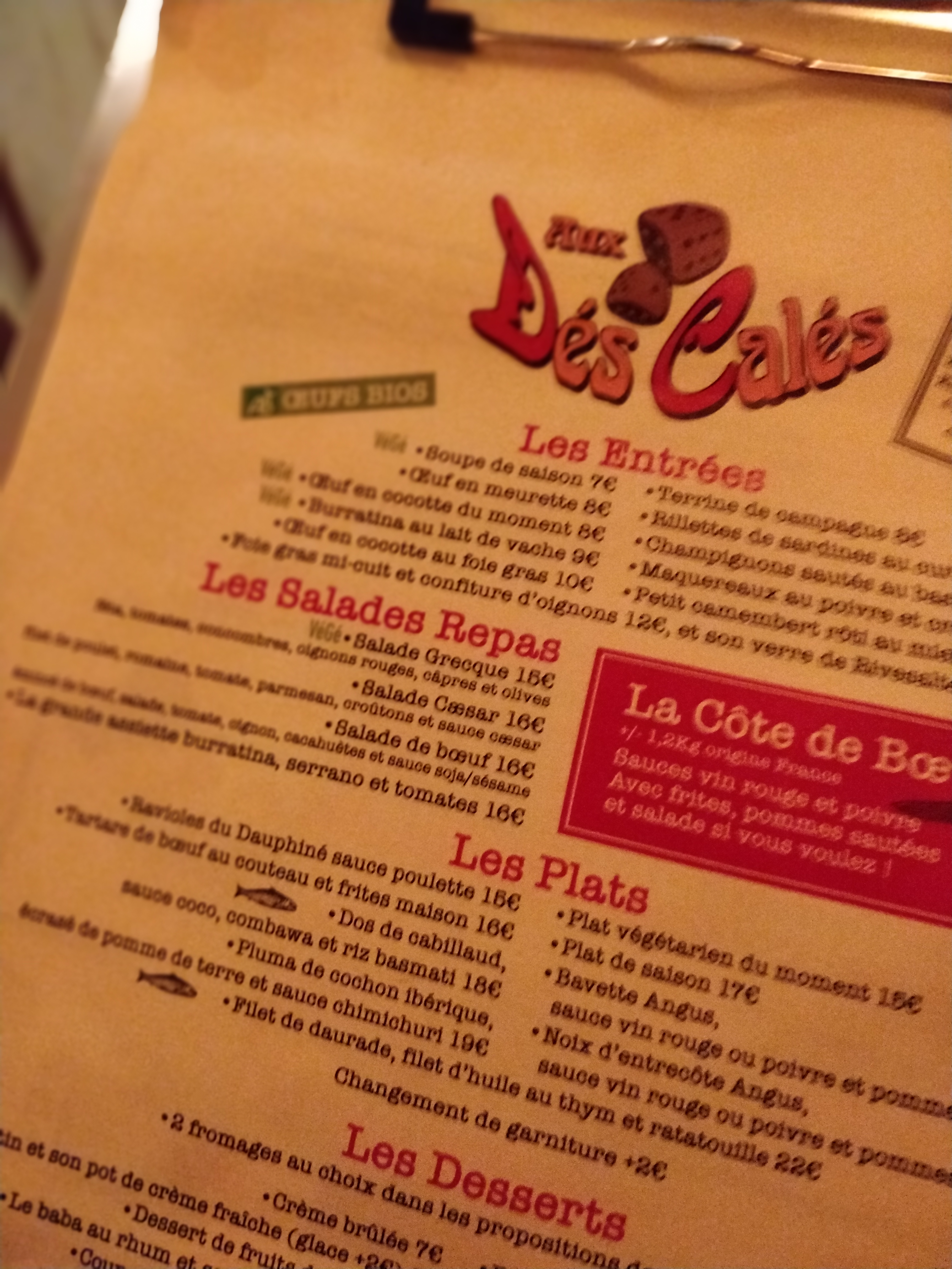 C'est la deuxième fois que je suis allé aux Dés Calés, 4 ans après ! Mêmes points positifs : super accueil, endroit sympa et chaleureux, personnel agréable et tarifs acceptables ! Malgré toutes ces qualités j'ai le même ressenti que lors de la première expérience concernant la cuisine : c'est bon mais rien d'exceptionnel (les œufs cocotte étaient des œufs durs...). Très sympa pour boire un verre, se poser en terrasse et/ou partager une planche, par contre la concurrence des restaurants/bistro rue Legendre/Guy Môquet donne envie d'aller voir ailleurs si on recherche des plats savoureux et un poil plus élaborés (975, Maison Lacaille, Tables d'Augustin...).