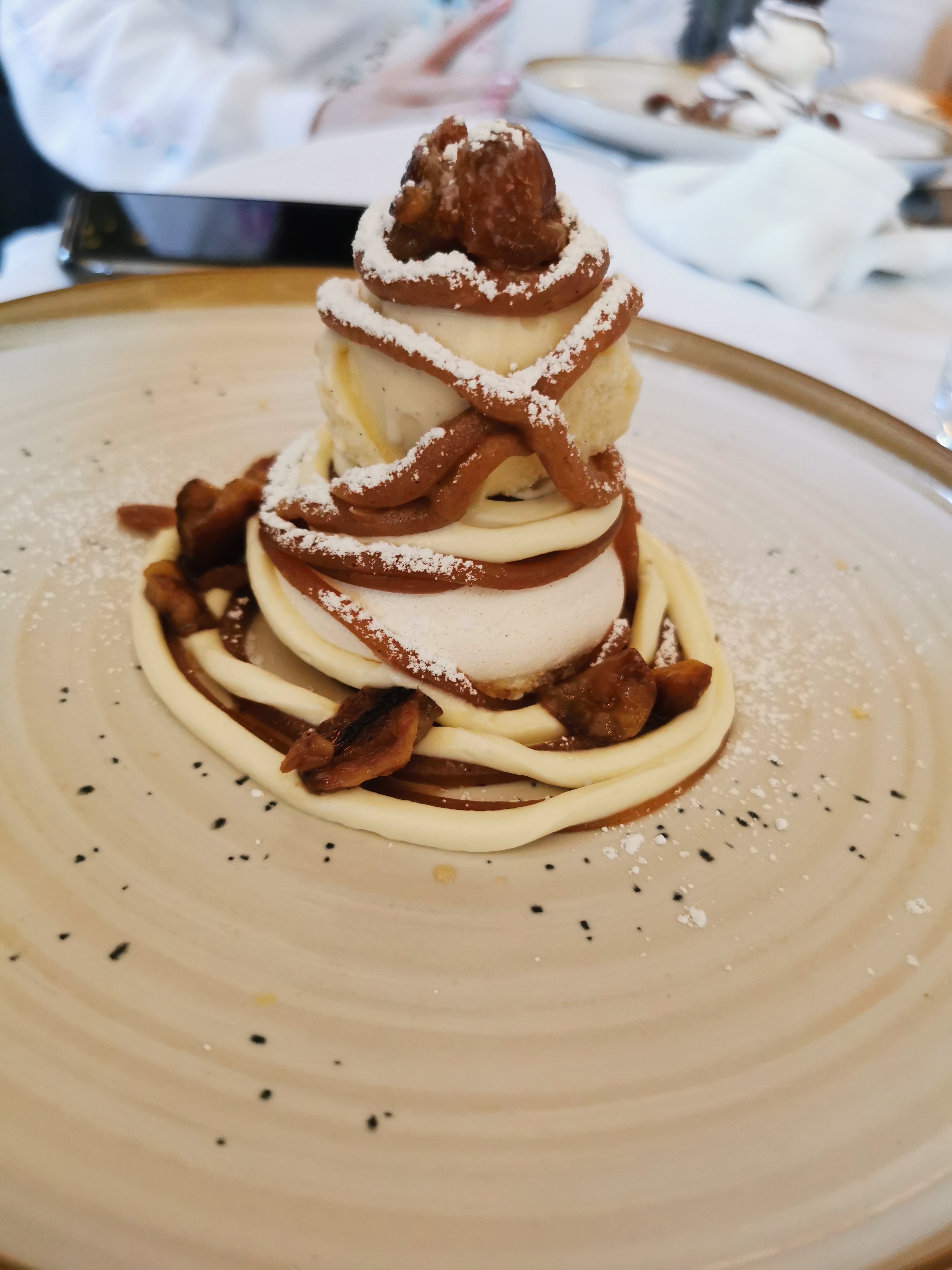 Cadre magnifique. Serveuse aimable et compétente (elle ne note pas les commandes et ne se trompe pas pour servir les plats sur une table de 10 couverts ! Quelle mémoire ! Bravo). Présentation au top et plat succulents. Établissement a recommander.