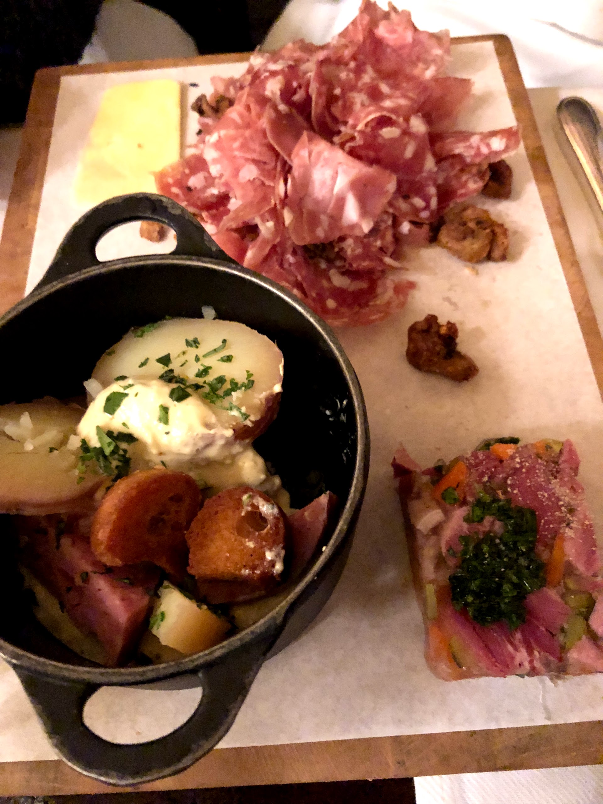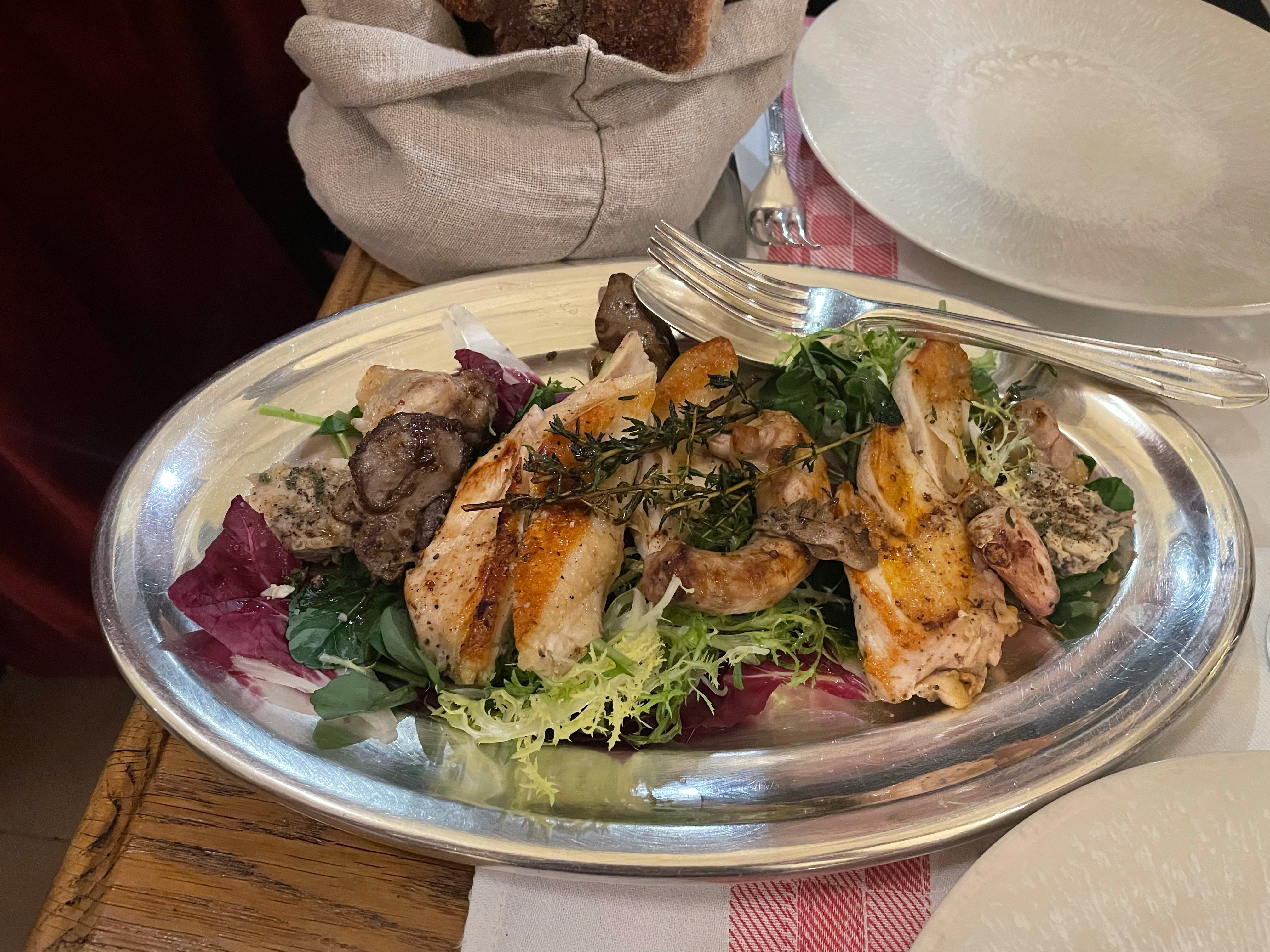 Cuisine française classique avec un excellent service et un personnel sympathique. J'en ai eu beaucoup trop pour 2 mais j'avais l'assiette de charcuterie et de fromage pour les entrées. Grande assiette de charcuterie servie avec cornichons et graisse frite. J'ai commandé le poulet fermier avec des légumes et le ris de veau avec macaroni au fromage. Les deux étaient délicieux. Si vous n'aimez pas le cerveau, essayez le ris de veau. Doux, ironique, beurré sont les saveurs qui me viennent à l’esprit. Le poulet cuit avec les légumes dans une sauce légère au lait et au beurre était incroyable.