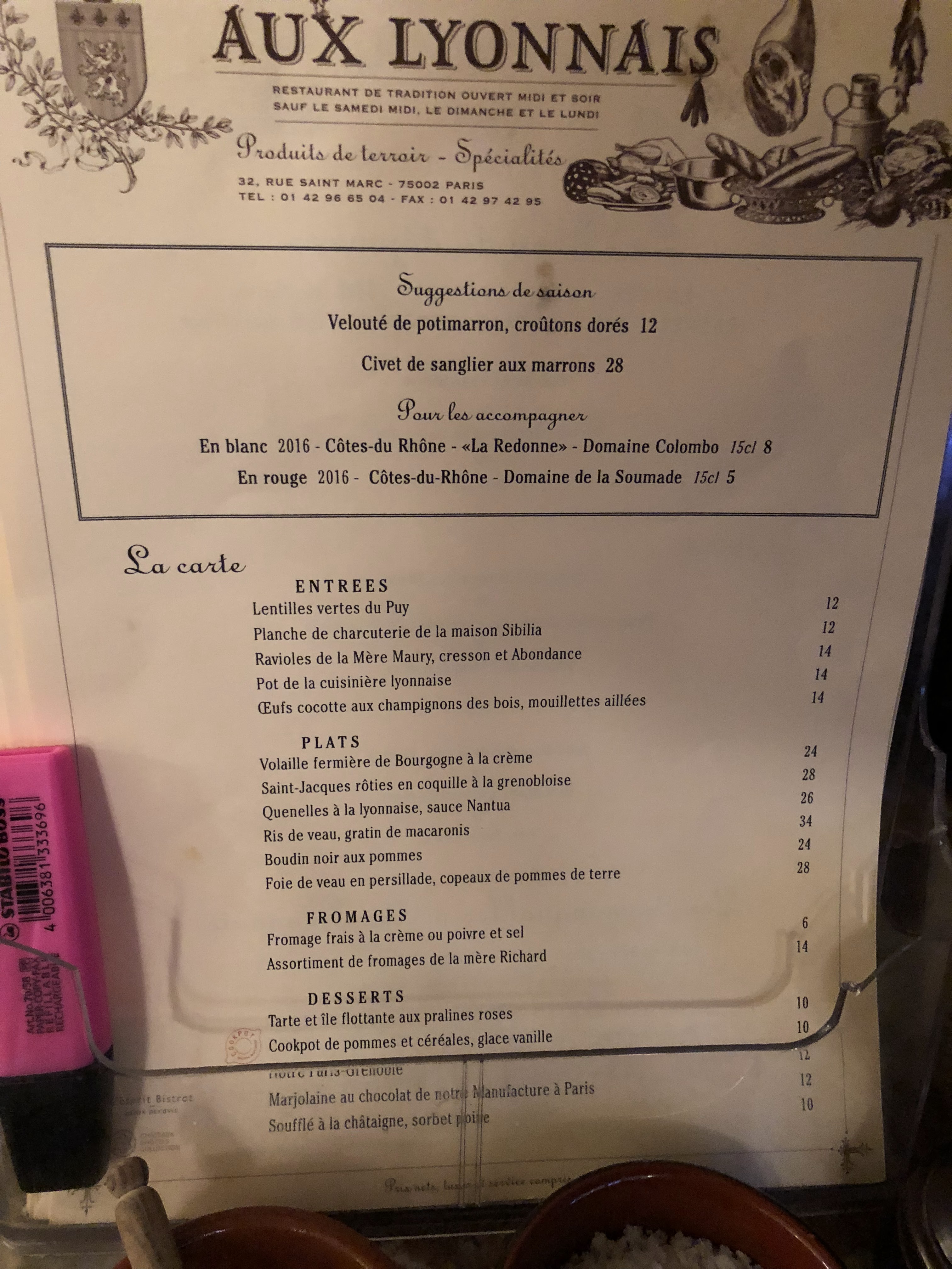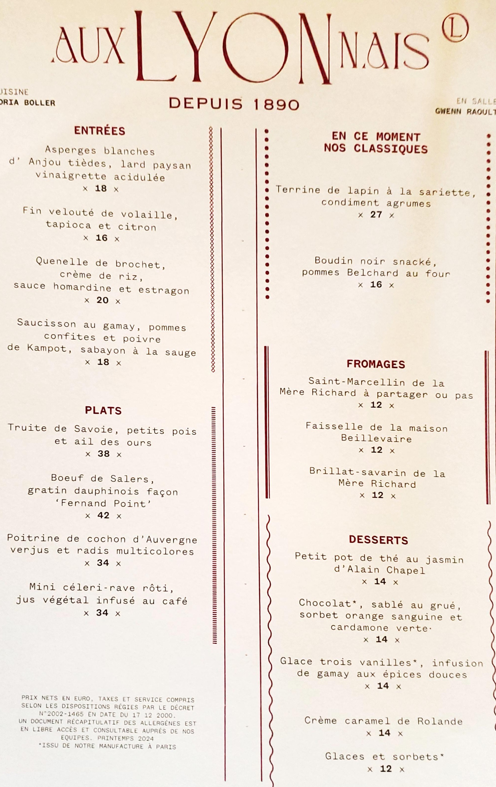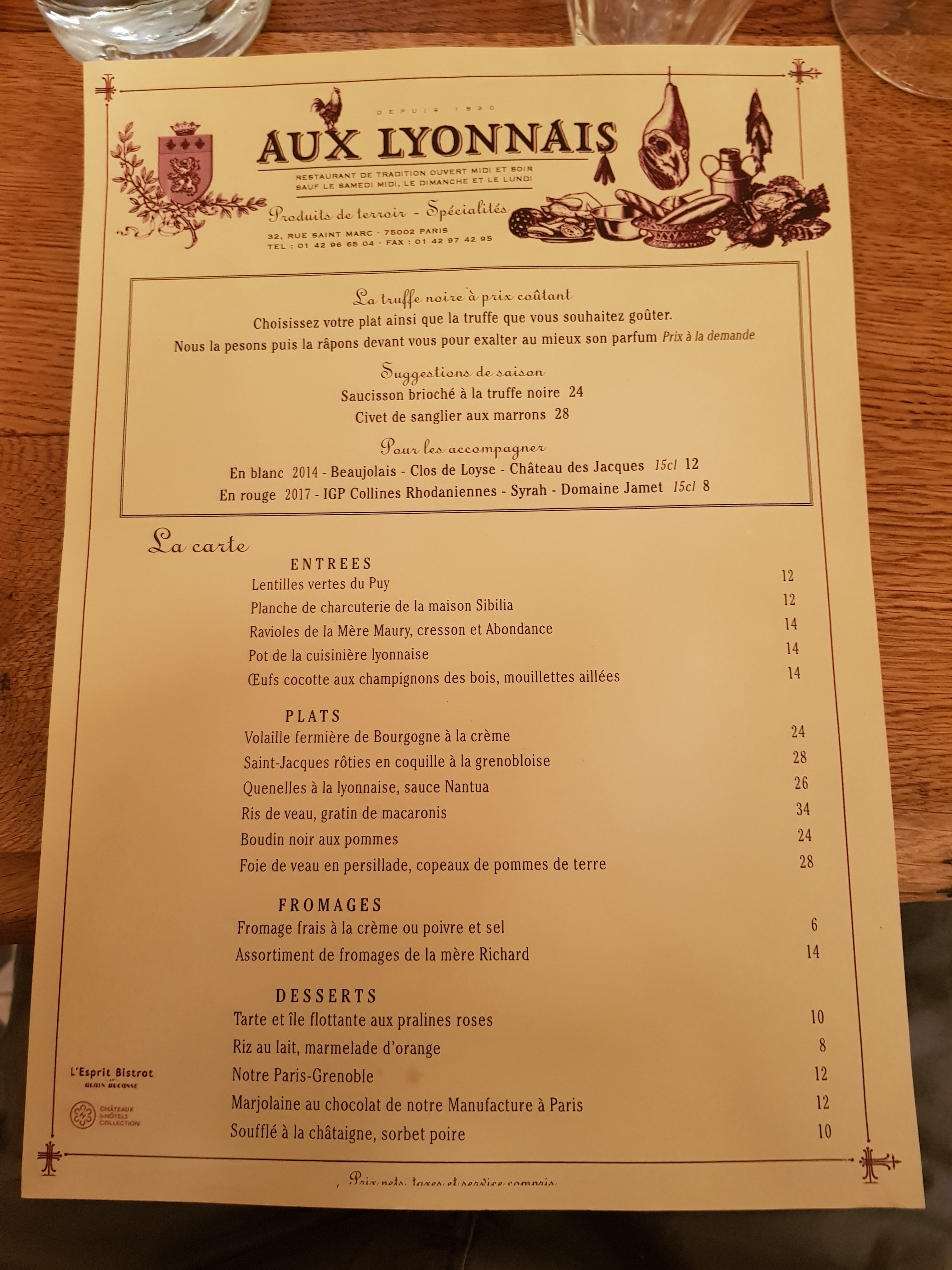 Que s'est il passé aux Lyonnais ? C'était à mon sens une valeur sûre mais le machon du dimanche était plus que décevant Asperges pas cuite idem pour l artichaut. Sauvisson lyonnais acide, Les cuisses de grenouilles sans goût. La mousse au chocolat aucune tenue un Cafe était acide c'est un peu gros Aucune Indication quant aux plats aucune explication, les équipes sont débordées... Dommage que cela ait perdu la saveur d'autrefois. Je sors dépitée restant sur ma faim...