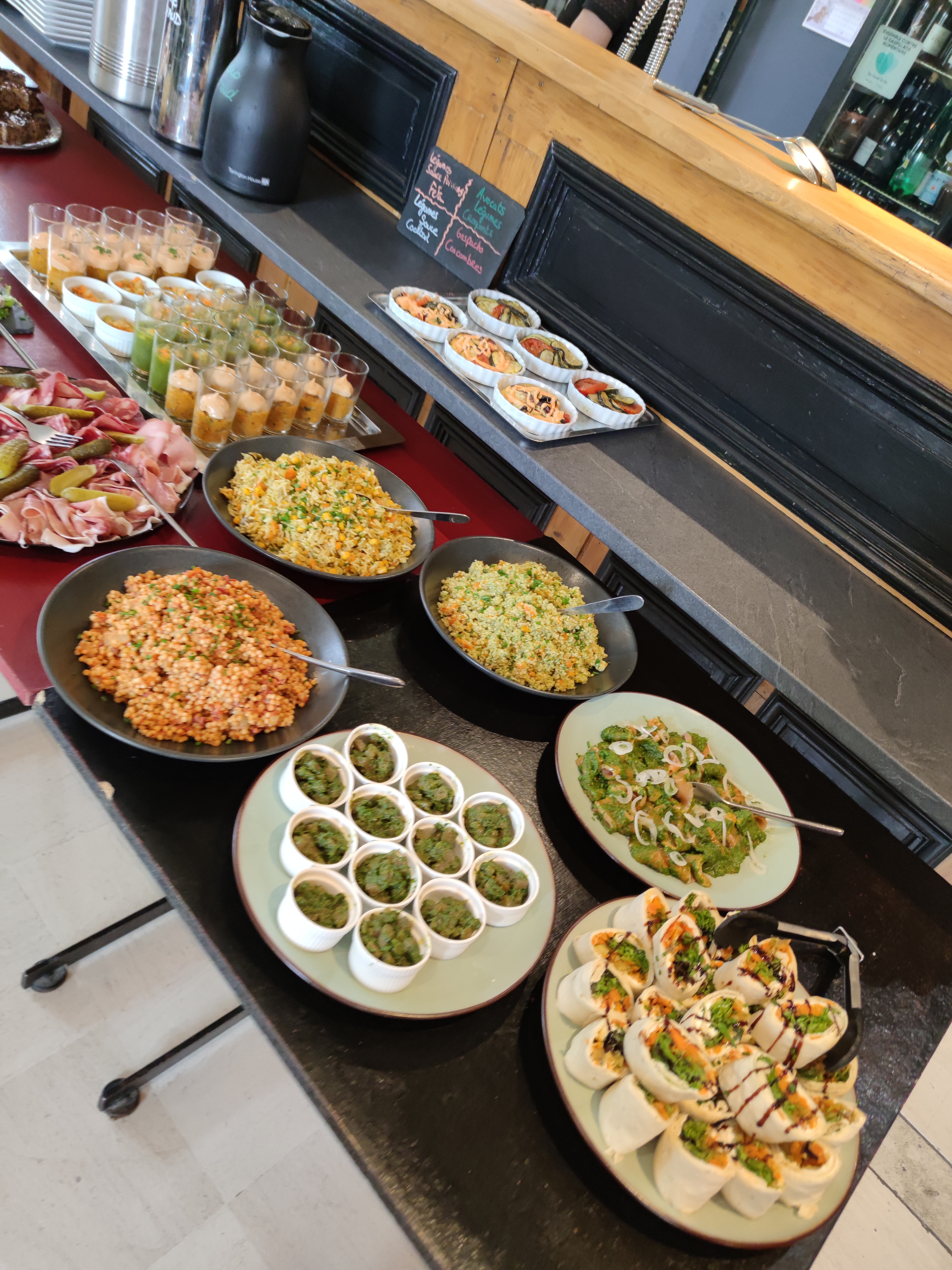Un brunch extraordinaire ! Des legumes, des œufs, des tas de petites compositions à base de legumes, poissons, viande … des desserts à tomber ! Mousse au chocolat sans œufs divine … bref allez y c’est top !!!
