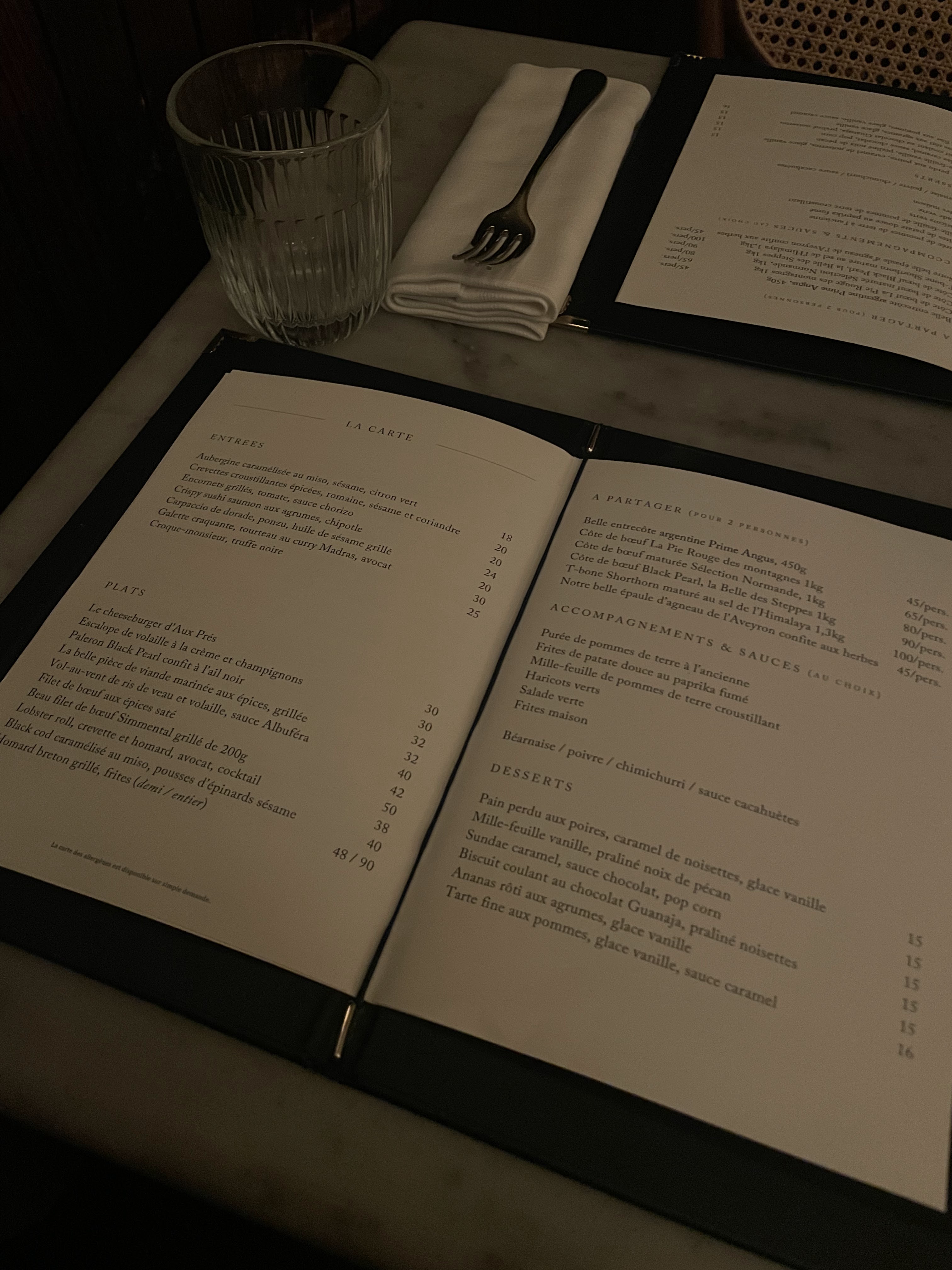 Experience super Aux Prés, j'ai aimé surtout le décor et les plats. L'atmosphère est agréablement sombre, élégante, le personnel gentil et j'ai finalement eu le plaisir de gouter le ris de veau dans un superbe vol-au-vent (40 euros), et j'ai essayé aussi un autre plat extrêmement bon, le black cod , (toujours 40 euros). En entrée le crispy sushi aussi très goûteux et intéressant (24 euros), je l'ai vraiment apprécié. Pour conclure, millefeuille pas mal à 15 euros. Bouteille de château branaire 2014, 70 euros en promotion, Espresso 4 euros et bouteille de Vittel 7 euros. Globalement le restaurant est donc plutôt cher, prix presque au niveau d'un restaurant 1 étoile Michelin mais le niveau est vraiment élevé.