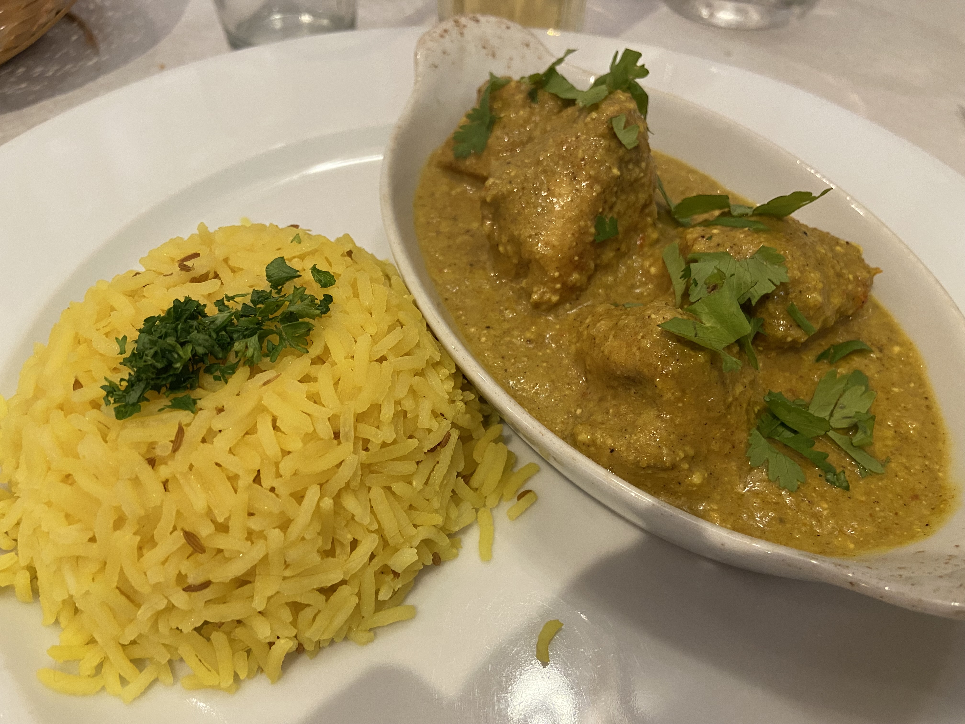 Nous sommes allés au restaurant et avons été très bien accueillis. Nous avons mangé le fameux Fish and chips et le korma de poulet dont le pain était moelleux. Tout était copieux et très bon !! 👌