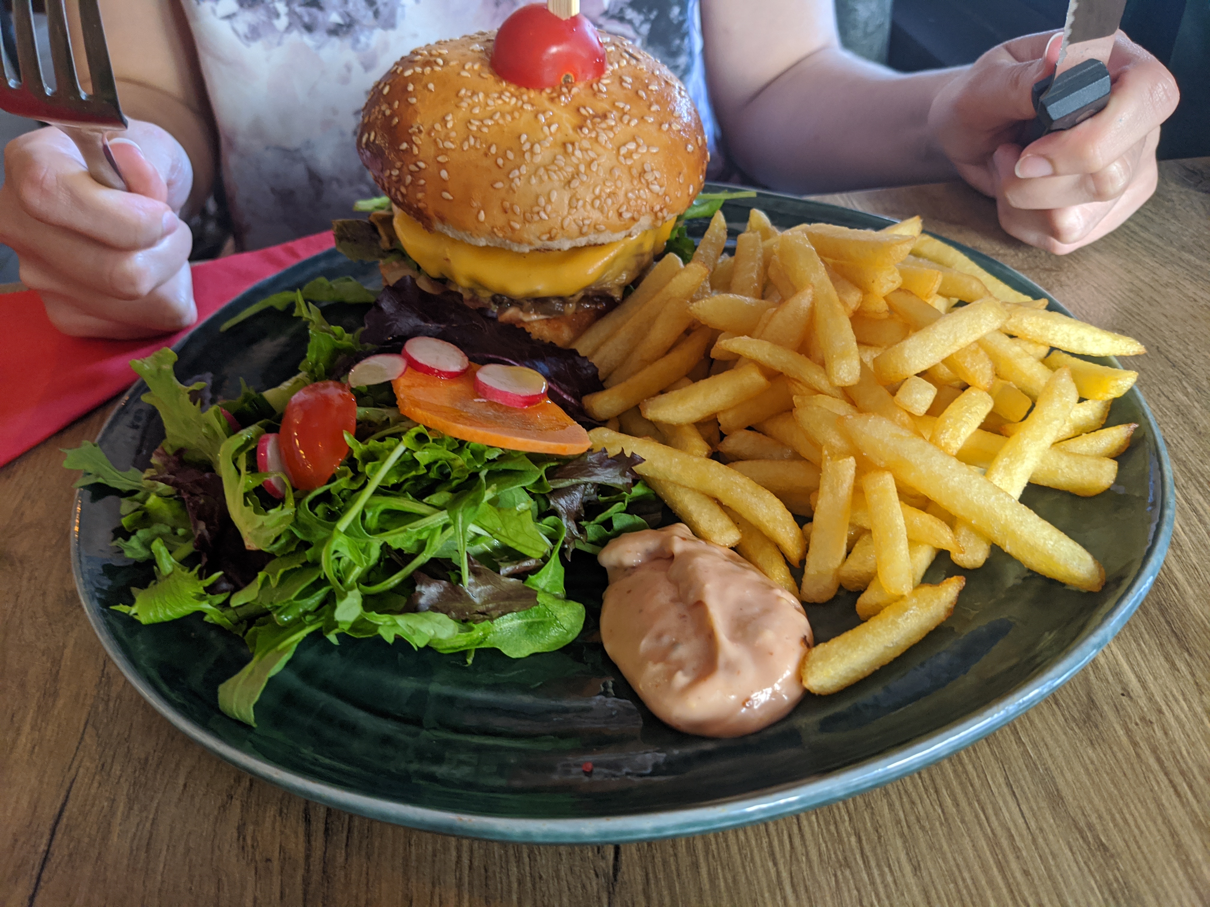 Belle brasserie bien remplie où nous avons mangé un bon Burger bœuf effiloché, d’excellentes frites maison et une belle assiette des 3 arbres (appréciable en été je pense). Desserts bons: poire et crème coco. Par contre, il est dommage de ne plus avoir la seule entrée à 13h et qu’une alternative de plat, donc de passer à côté du menu.