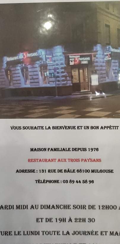 Voici toutes les informations sur le Restaurant marocain Aux Trois Paysans qui ce trouve au 131 Rue de Bâle, 68100 Mulhouse (68). Sur cette fiche vous trouverez les photos, l'adresse, les horaires d'ouverture, le numero de téléphone et les avis clients.Vous pouvez églement rédiger un avis si vous le souhaitez en bas de page.