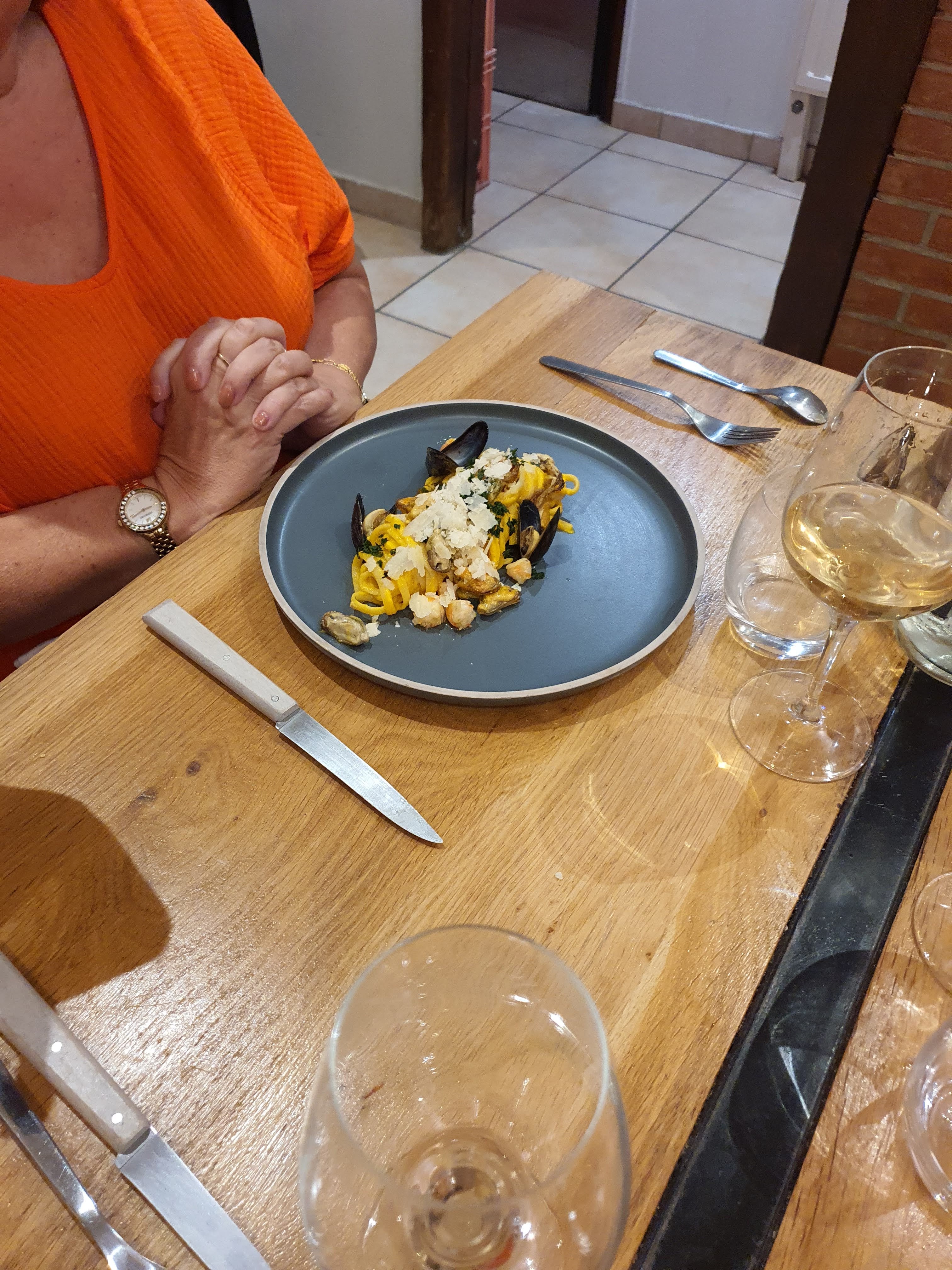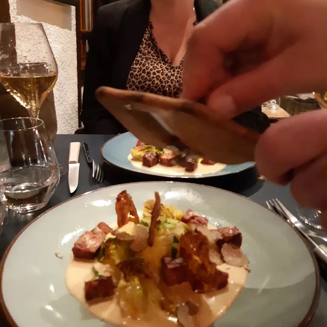 Nous y avons soupé entre amis (4 couples). L'acceuil est sympathiques. Le cadre agréable. Le service bon, et plats sont savoureux. Mais si vous êtes pressés ou fatigués, il vaut choisir 1 autre resto... nous avons attendus 1h30 pour l'entrée, nous nous sommes rués sur le pain et le vin pour compenser. Le proprio, se sentant gêné pour nous, nous a gentiment offert le pouce café 🥰 déjà sympa 😁
