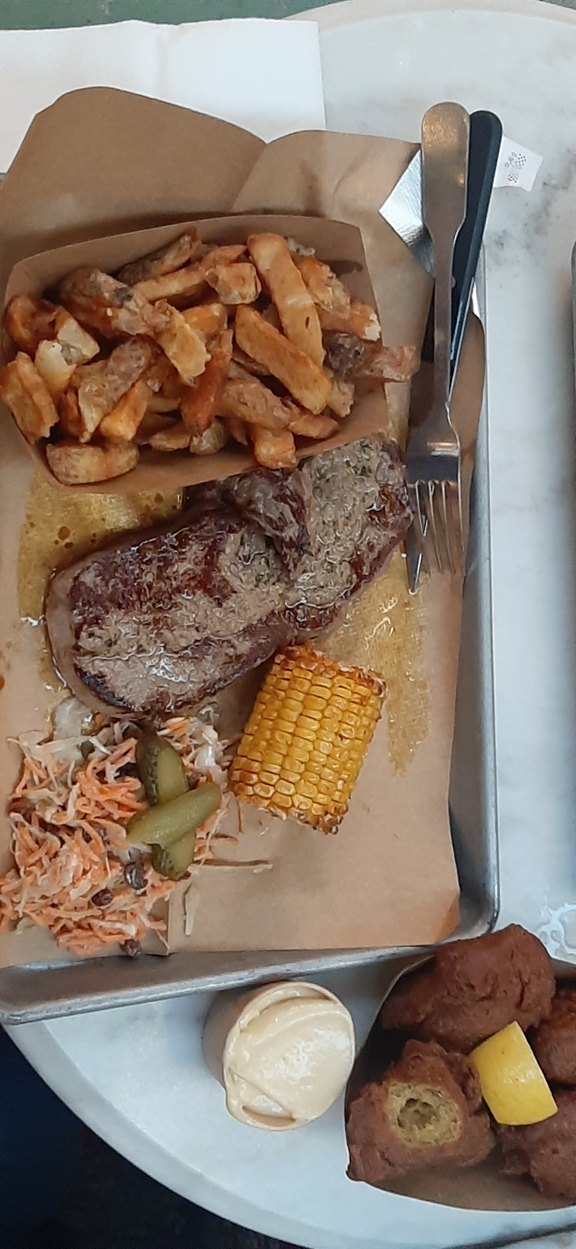 Beaucoup de monde le samedi midi, beaucoup d'attente (plus de 20 minutes pour commander, 45 minutes pour avoir le burger, ils nous avaient oublié, super ☹️ ) et on arrive à table, ils s'étaient trompés de burger 😅 et puis les ingredients sont pas fidèles à ceux affichés (burger crispy pas d'onions rings mais 10 minis morceaux d'oignon crispy que j'aime moins) enfin bon pas mauvais mais grosse déception culinaire. Par contre je conseille pour la déco, l'originalité du lieu et les desserts 😉