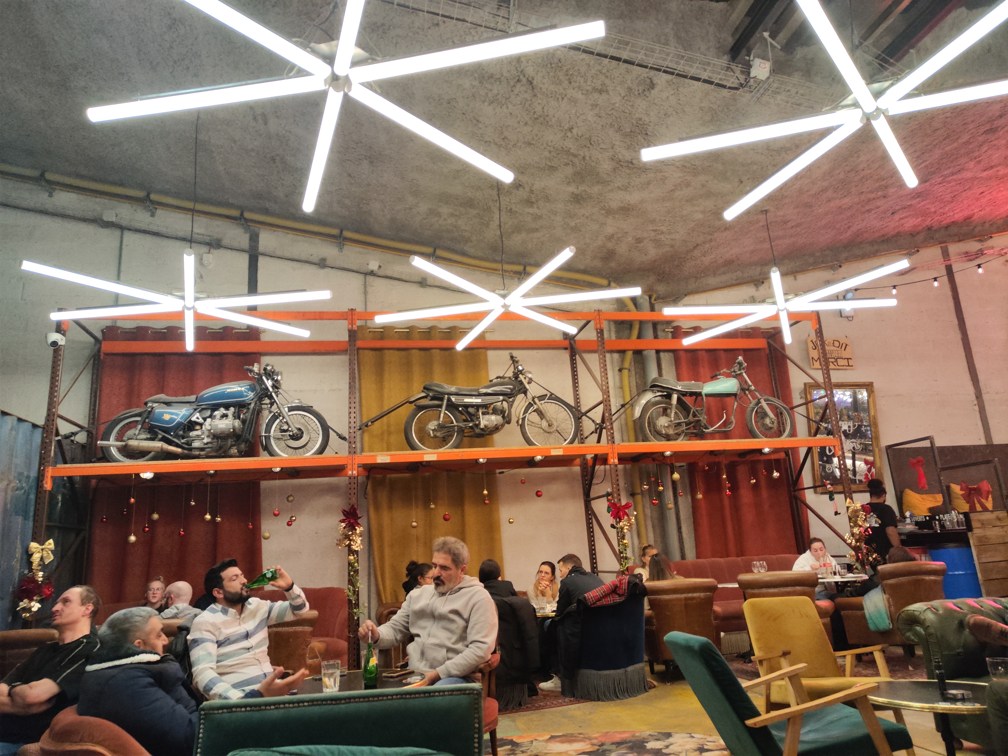 Un lieu unique que je n ai vu nulle part ailleurs pour le moment. Ce bar propose un concept original. Vous pouvez venir en moto ou voiture ancienne et la gare dans l entree du bar. Ce qui vous permets d éviter de chercher une place et de faire profiter autrui de votre bolide. Les serveurs sont aimables et courtois. La carte est disponible via Qrcode suite au Covid-19. Les tarifs sont au niveau d un bar standard mais vous avez l ambiance en plus. Les motos présentes dans ce bar ainsi que l ambiance indus m ont beaucoup plu. Je recommande absolutement si vous êtes dans le coin !