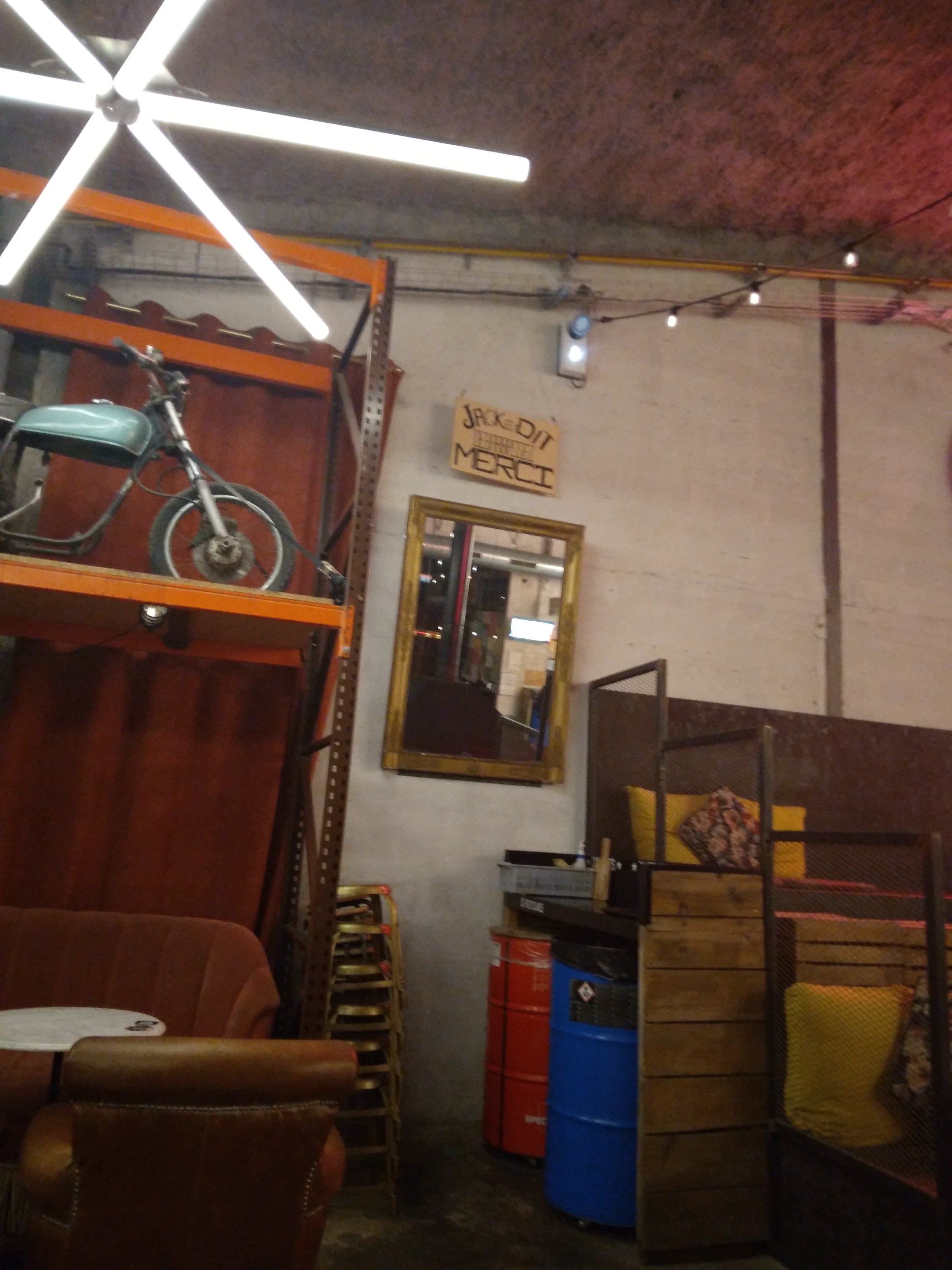Endroit super ! J'adore le concept du restaurant. On peut très bien y prendre un verre comme y manger. On pourrait faire ça tous les jours (mais on est pas dans la region). Je recommande vivement de tester le restaurant et l'emplacement ! Un mélange des genres (rétro / garage etc...)! J'y reviendrai volontiers !