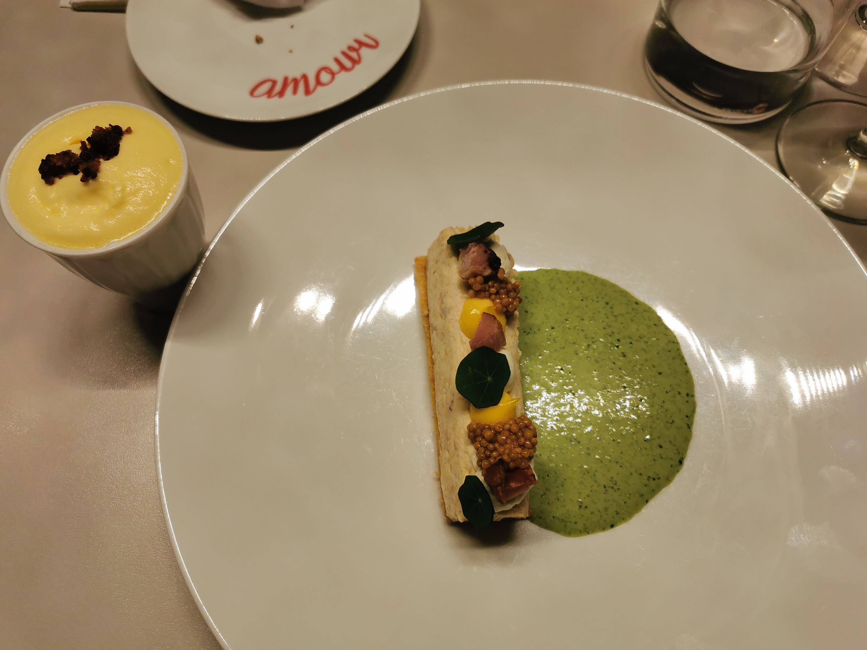 1ere expérience du Avec Amour à Terville . l'arrivée et la découverte du restaurant est à la fois compliquée et déconcertante, compliquée car très peu de visibilité du restaurant en extérieur et déconcertante car l'entrée est petite mais une fois rentré on découvre un lieu moderne et chaleureux décoré avec goût. l’accueil est impeccable et très professionnel comme le sera tout le service. coté cuisine tout est fait pour un plaisir maximum avec des produits du terroir Lorrain et un savoir faire évident . seul bémol de notre soirée un prix un peu excessif (177€ pour 2 personnes) En conclusion belle adresse à retenir surtout que la particularité des cartes vierges oblige le restaurant à modifier ses cartes tous les 15 jours donc la promesse de nouvelles expériences mais prévoyez la nounou pour les enfants car le concept nest clairement pas fait pour eux.