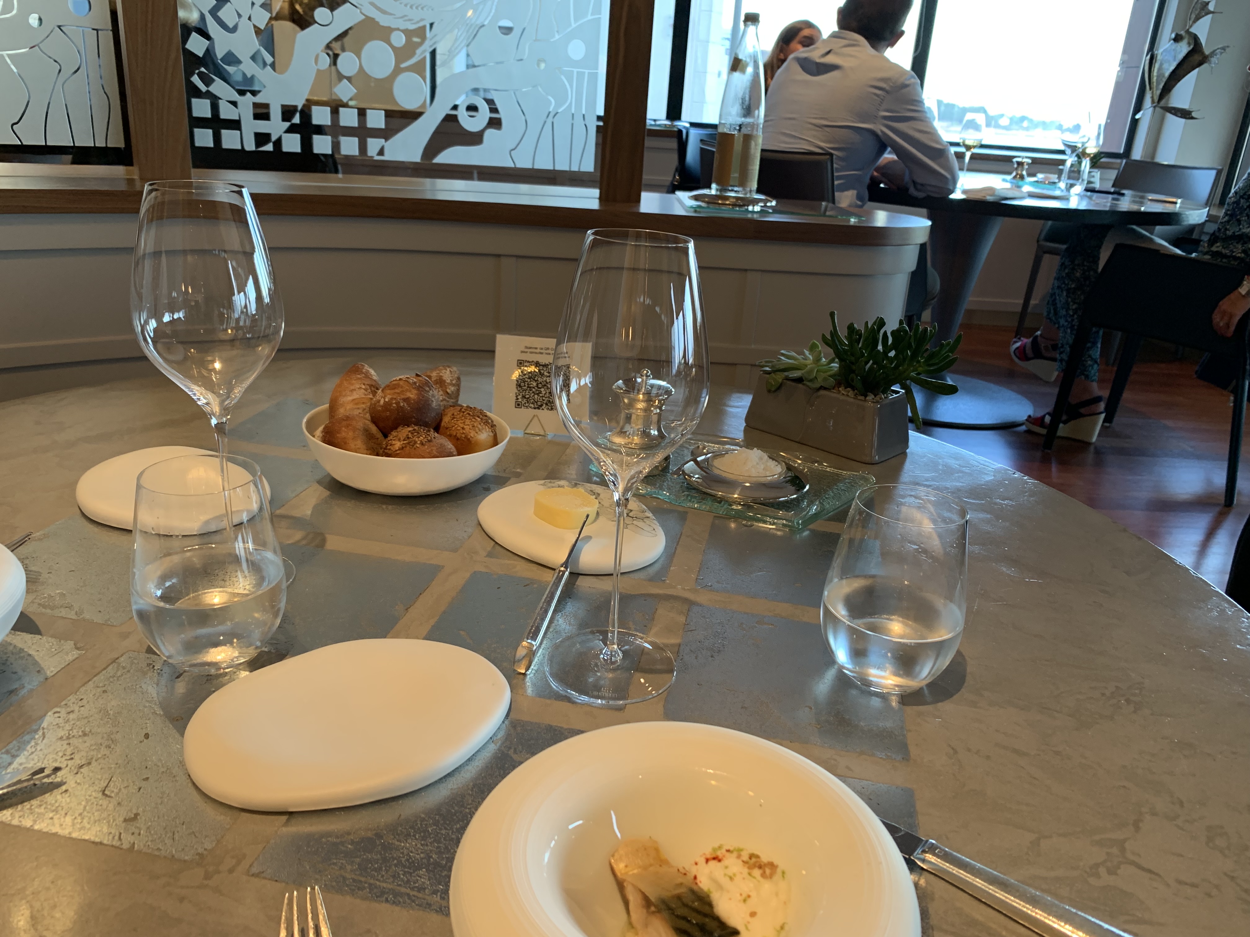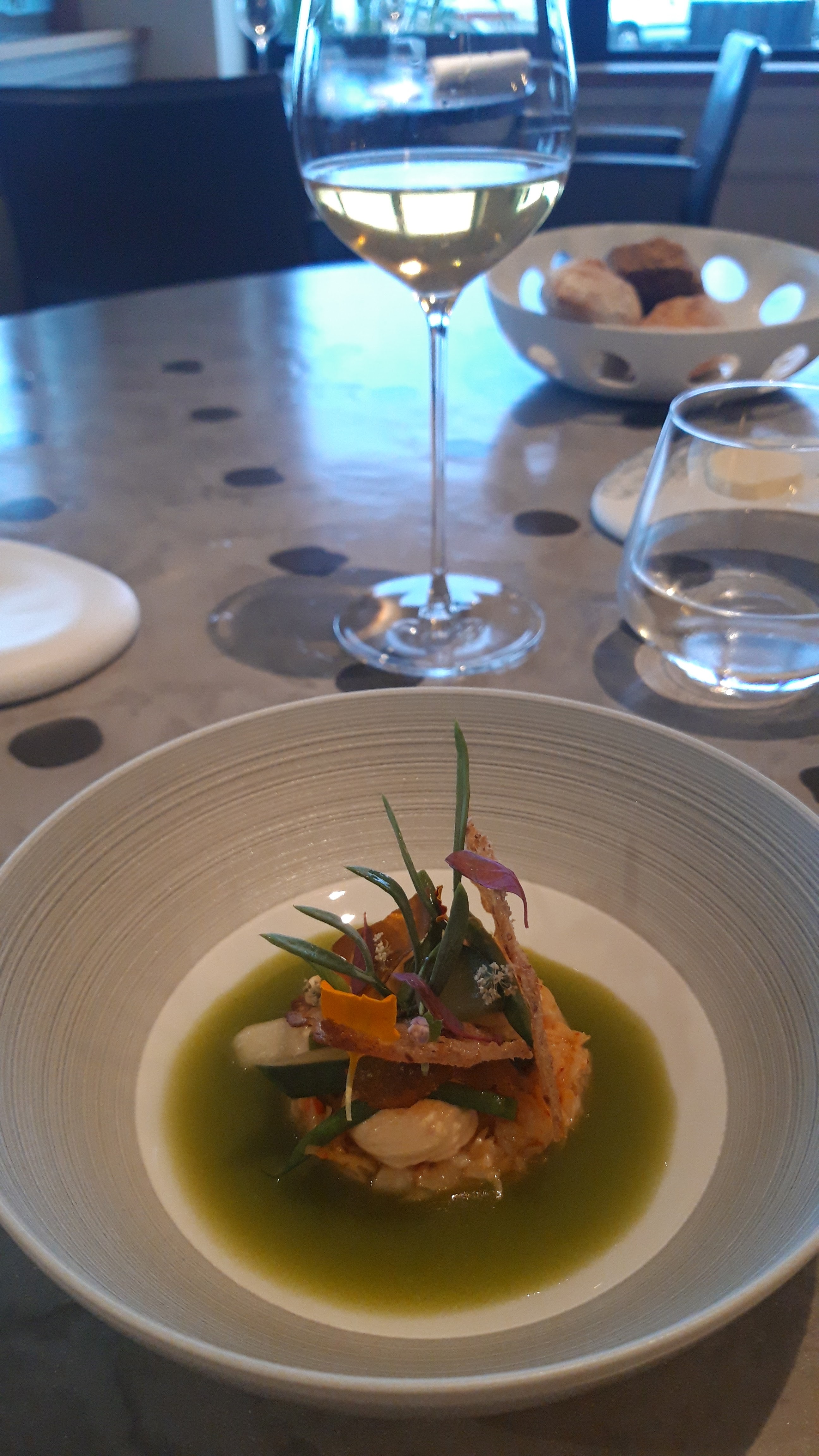 Une belle adresse vue sur la petite mer calme de Gâvre. Rapidement le regard plonge dans les amuses bouches parfaitement équilibrées, le vent se lève et les yeux se ferment pour compter les saveurs, les alliances, les douceurs et les croquants. Un joli festival en bouche (les tomates ! Et la vague de douceur et son jus !) . Bravo aux chefs. Service impeccable , et sommelier d’excellent conseil qui maitrise sa carte. Mention spéciale pour les céramiques de « « Farida » qui accueillent tous ces mets : on peut passer commande ?